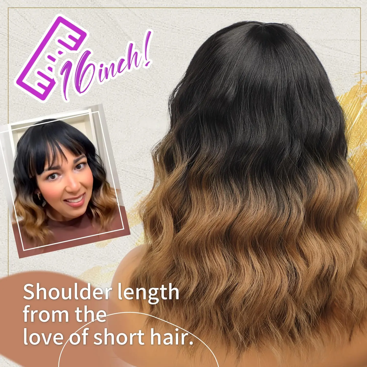 ·【Best wig for you】Ombre brown wig with bangs, 16 inches, 180 grams, light and full hair style. Gradient colors make the wig more layered. Liquid strands are short wavy for a natural and realistic look, fearless naturalness, good shape and overall. Transformed in one second, suitable for parties, birthdays, travel, celebrations, weddings, graduations, and daily life.