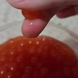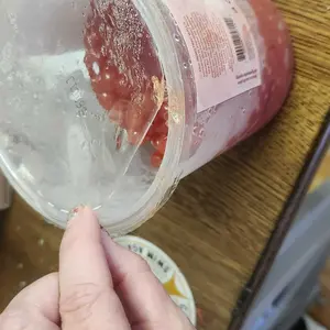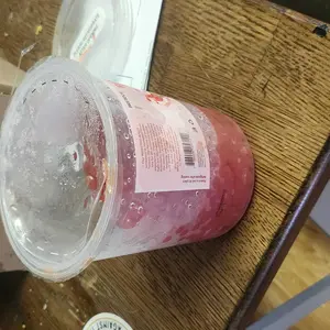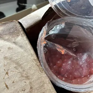 When I opened the package that it was in, it was filled with the boba juice. When I took the box out of the package that the boba was in, it was dripping and the whole box was soiled. So when I opened the box, I found that the side of the boba container was broken. I'm not happy.