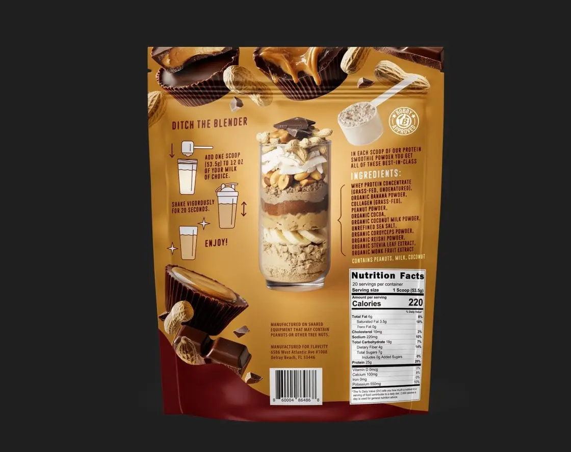 Chocolate Peanut Butter Protein Smoothie (20 servings): Get 25g of protein per serving in a rich, indulgent blend of chocolate and peanut butter. Made with real ingredients and designed for convenience, just scoop, shake, and sip—no blender needed. It’s everything your kitchen’s stocked with (protein powder, collagen, nut butters, and fruit) combined into one perfectly balanced smoothie.