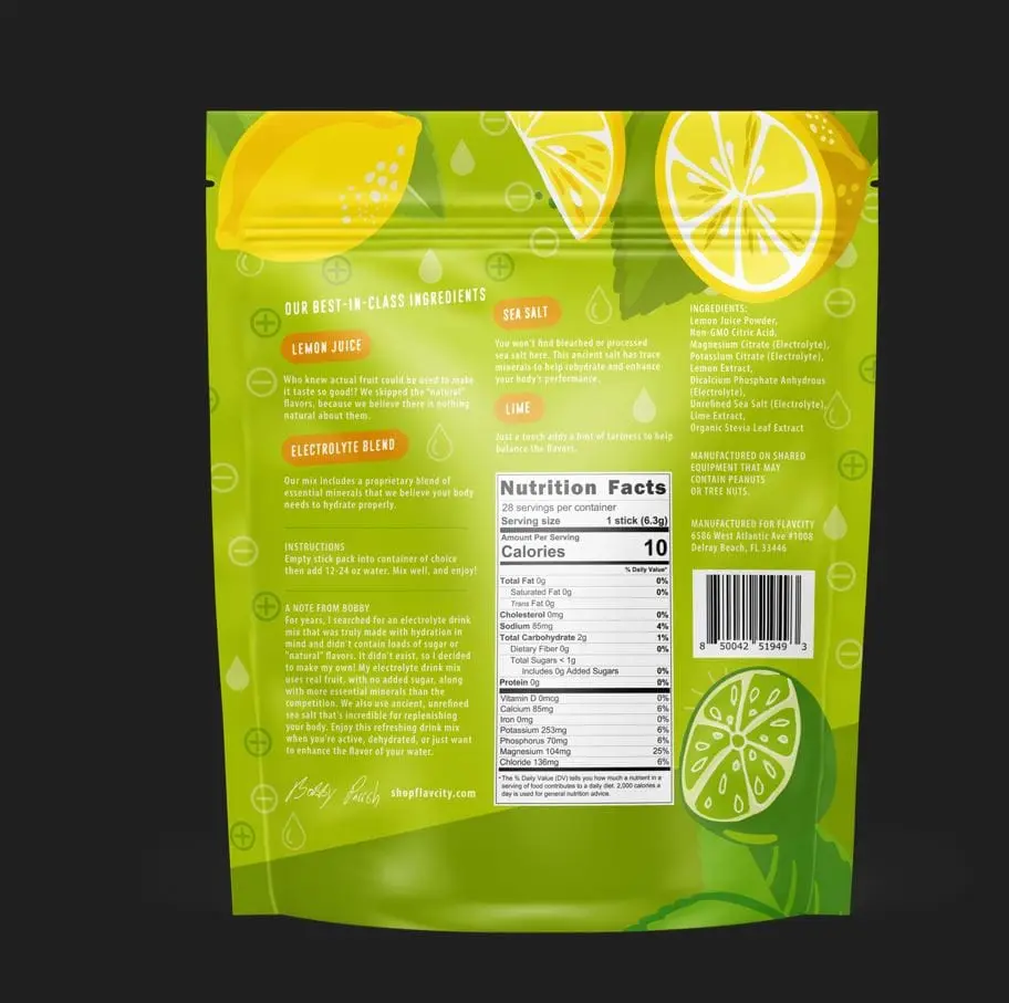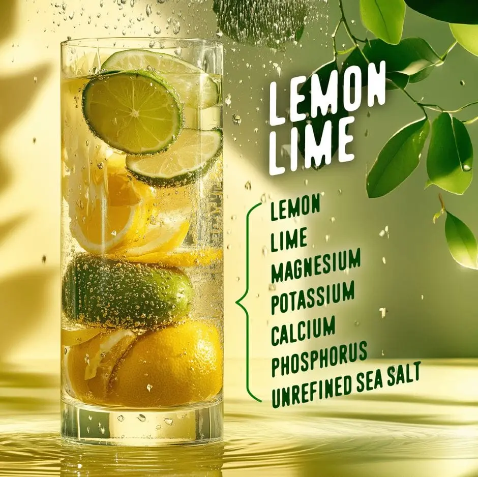 Lemon Lime Electrolyte: Lemon Juice Powder, Non-GMO Citric Acid, Magnesium Citrate (Electrolyte), Potassium Citrate (Electrolyte), Lemon Extract, Dicalcium Phosphate Anhydrous (Electrolyte), Unrefined Sea Salt (Electrolyte), Lime Extract, Organic Stevia Leaf Extract