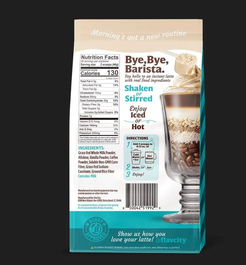 Vanilla Latte: 100% Grass-Fed Whole Milk Powder, Allulose, Vanilla Powder, Coffee Powder, Soluble Non-GMO Corn Fiber, Grass-Fed Sodium Caseinate, Ground Rice Fiber CONTAINS MILK