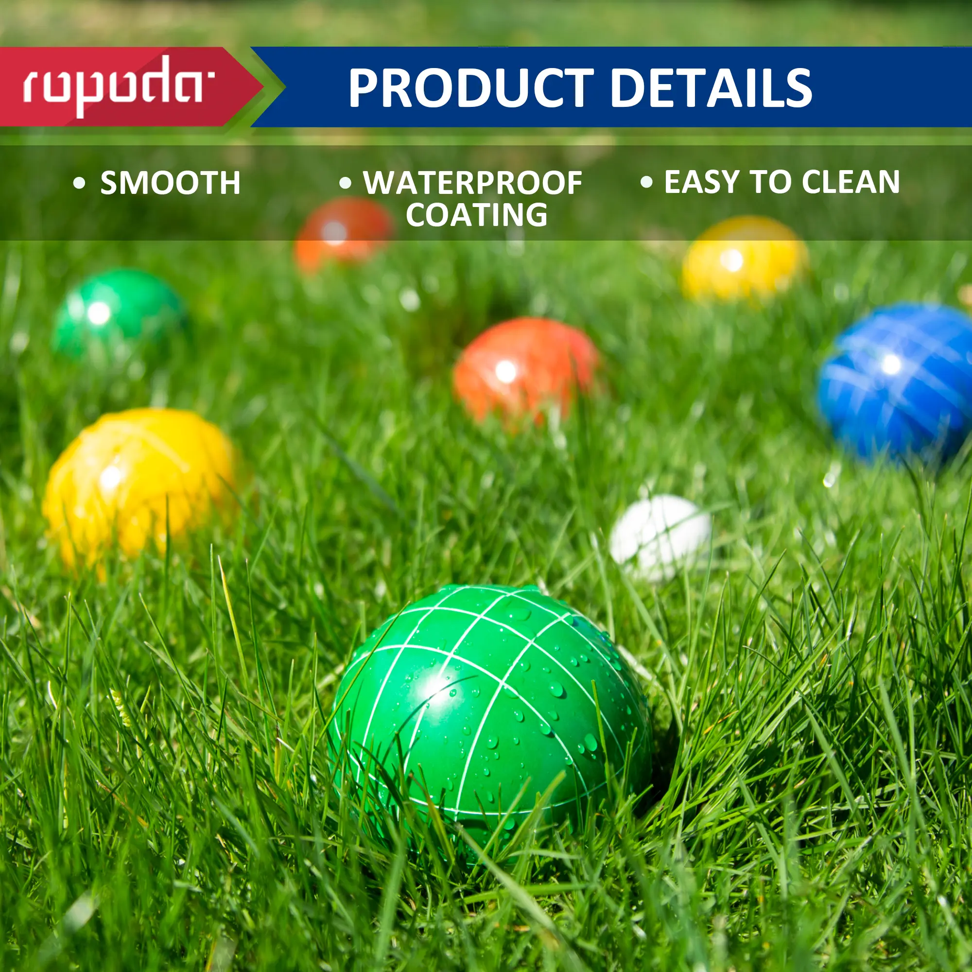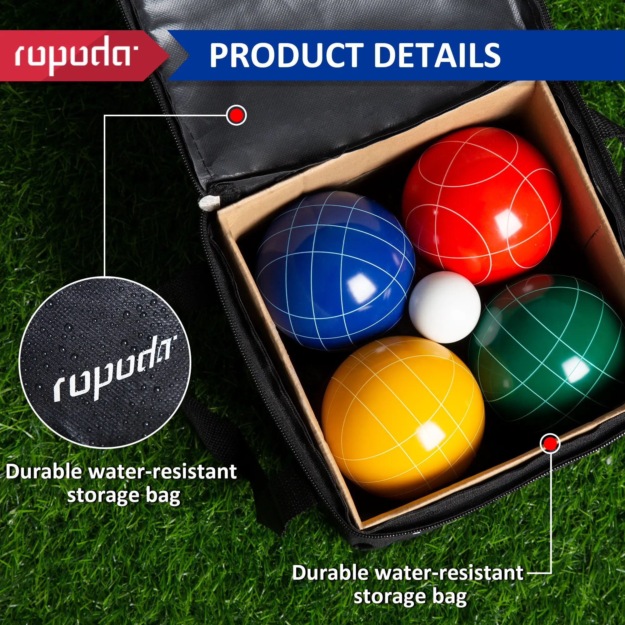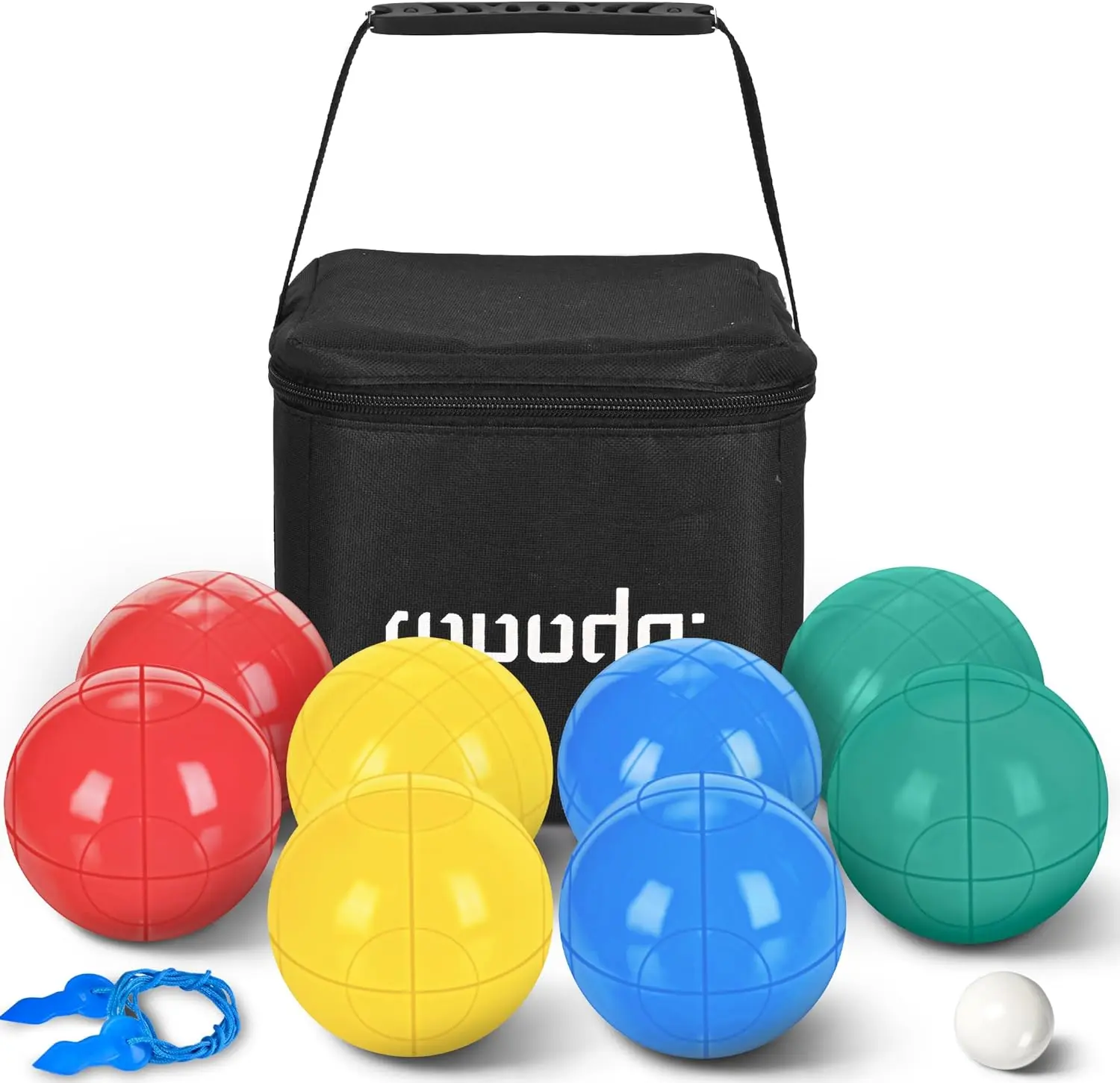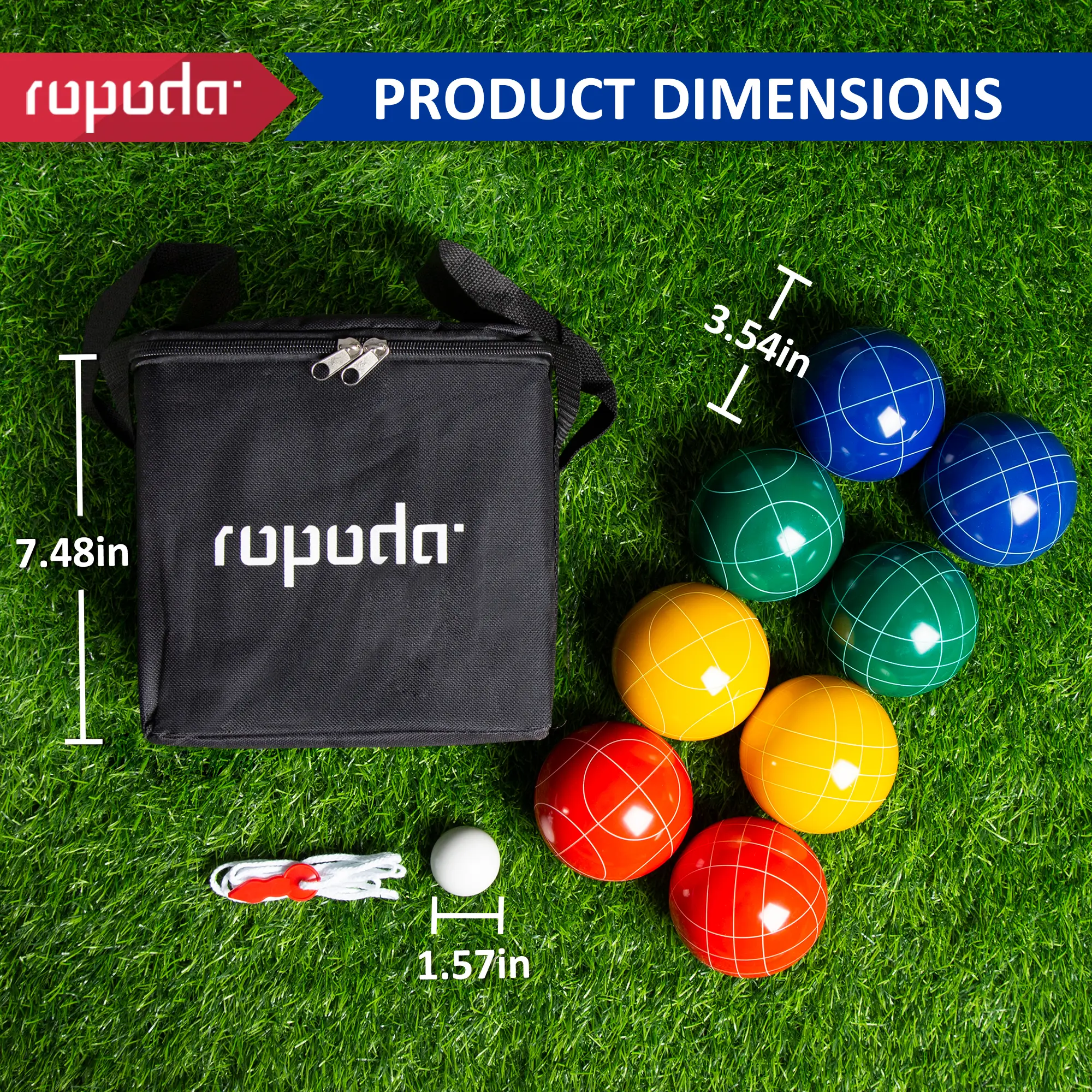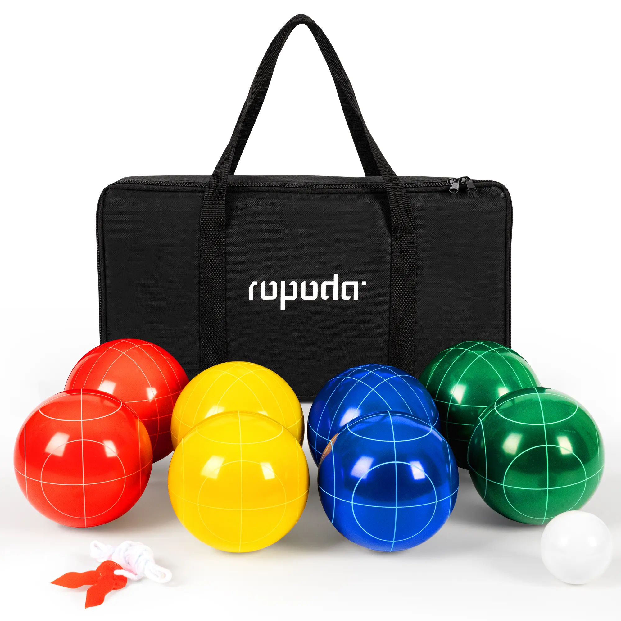 ·【COMPLETE BOCCE BALLS SET】 - ROPODA bocci ball sets regulation size includes 8 bocce balls (2 red, 2 blue, 2 green, 2 yellow), 1 while pallino, 1 measuring rope, and a carrying bag. Here are all items you need to play the bocce balls set.