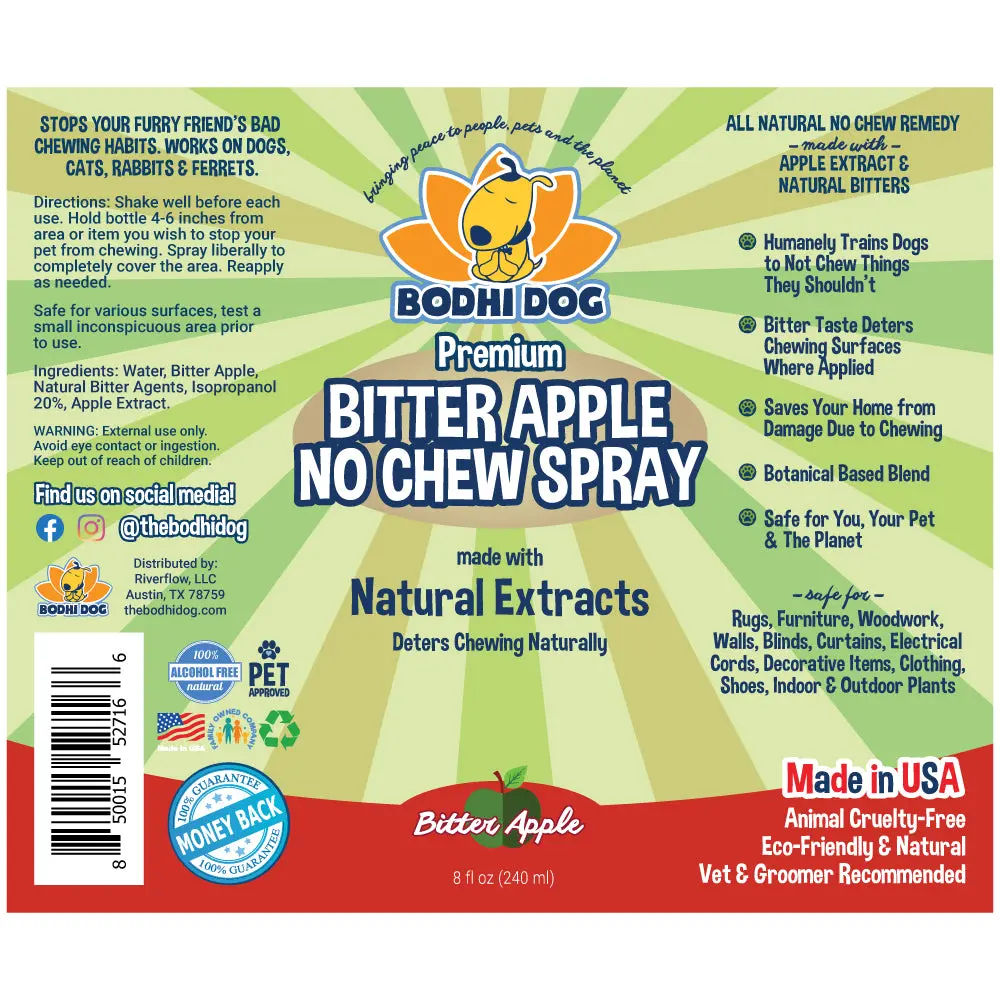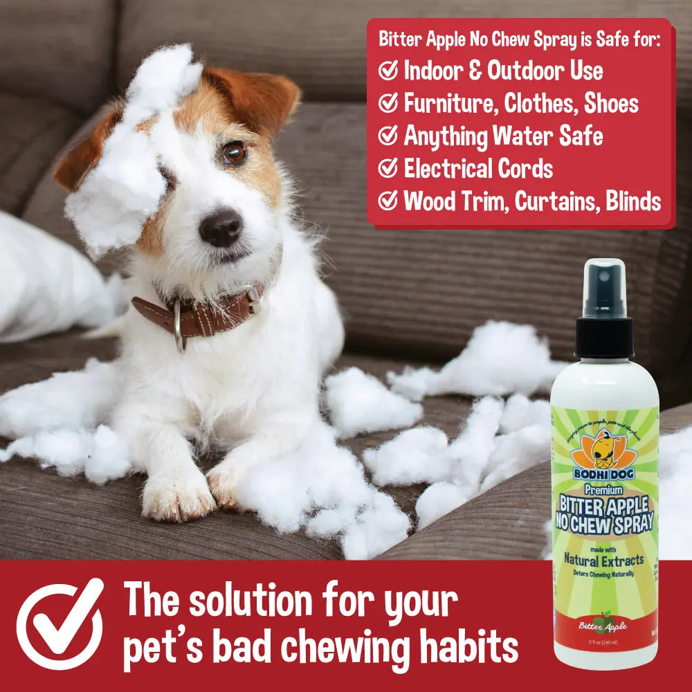 Keep your pet from chewing on furniture, shoes, plants, and more with our safe, effective Bitter Apple No Chew Spray. This gentle training tool discourages chewing without harsh chemicals or unsafe ingredients.