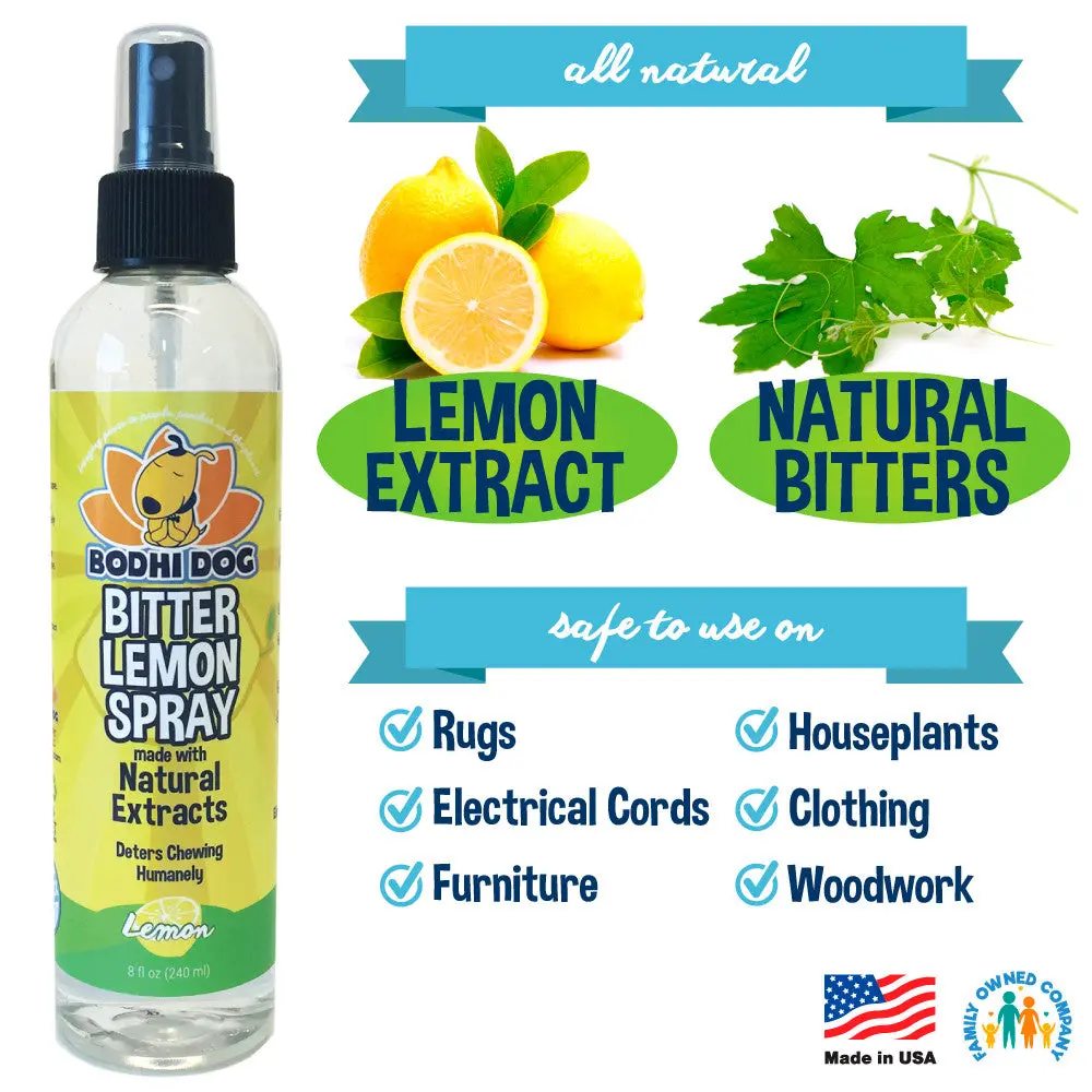 Keep your pet from chewing on furniture, shoes, plants, and more with our safe, effective Bitter Lemon Spray. This gentle training tool discourages chewing without using harsh chemicals or unsafe ingredients.