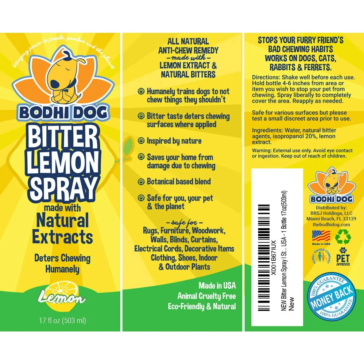 Bodhi Dog is a small, family-owned business based in Austin, Texas, and dedicated to creating safe, effective, and eco-conscious pet care products. Our Bitter Lemon Spray is proudly crafted in the USA using sustainable, cruelty-free practices and recyclable packaging. Our mission is to offer premium solutions to easily care for your furry family members.