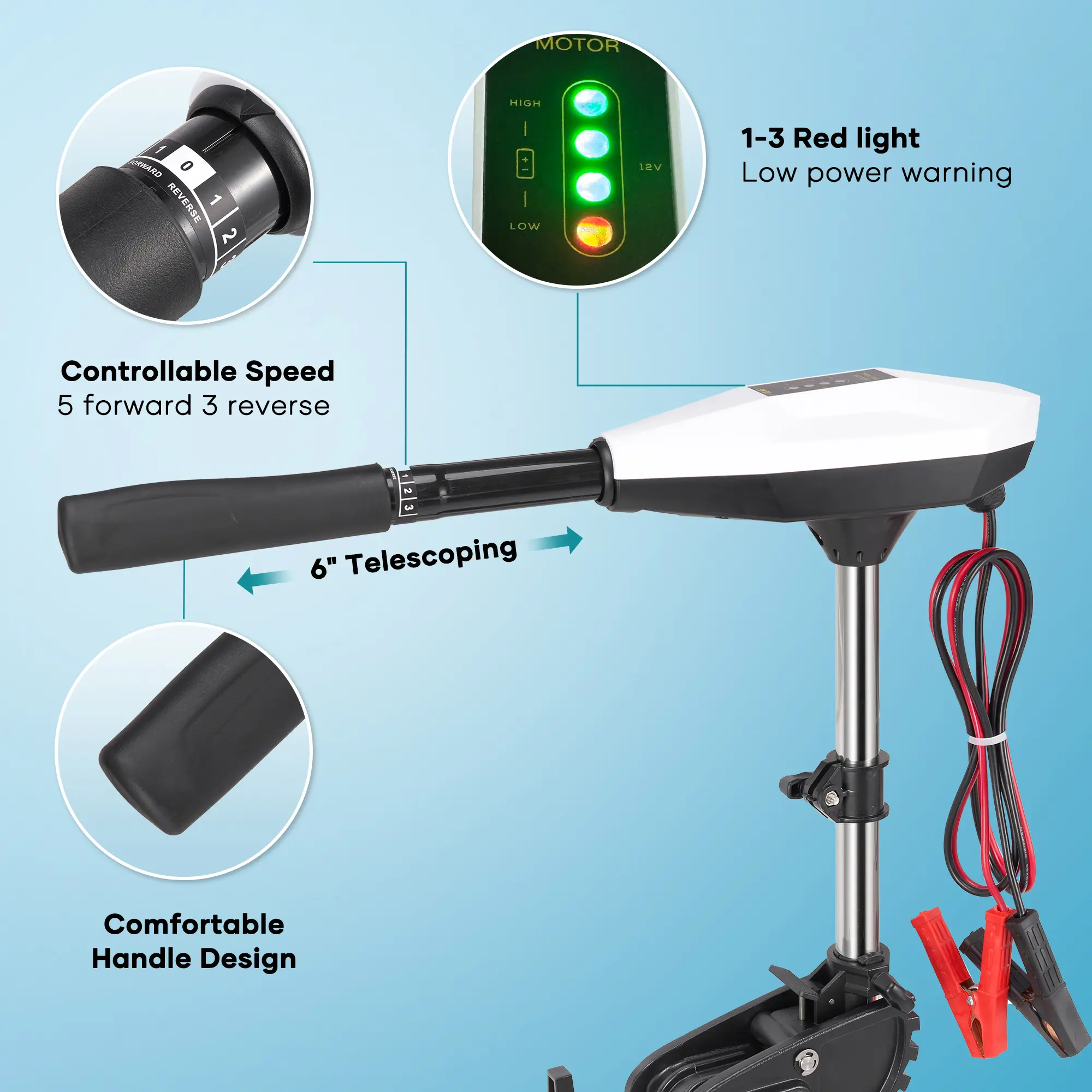 ·8-Speed Telescoping Handle: Experience enhanced control with this trolling motor's 8-speed system (5 forward, 3 reverse) for smooth handling in varying water. The user-friendly 6-inch telescoping handle extends/retracts easily, offering a comfortable grip and maneuverability. This contributes to responsive performance for your boat outboard motor or kayak motor, whether on calm lakes or in currents