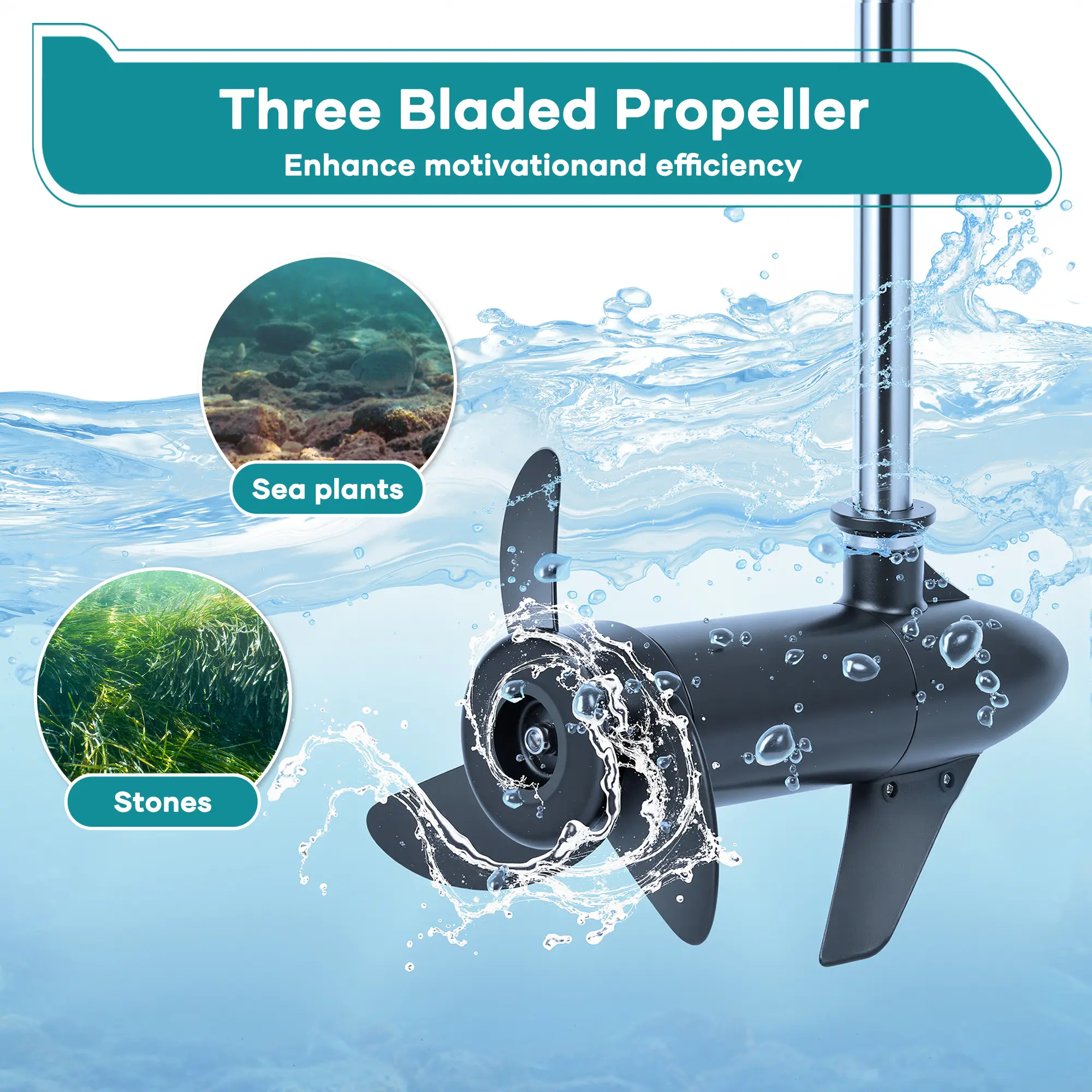 ·30-Inch Adjustable Shaft: Designed for versatility, this trolling motor features a 30-inch adjustable shaft for depth placement in shallow or deeper waters. The three-blade propeller enhances propulsion efficiency, reducing drag while delivering steady power for smooth operation. This aerodynamically balanced kayak motor or boat motor design helps minimize water resistance, contributing to a stable ride for kayaks and small fishing boats in freshwater
