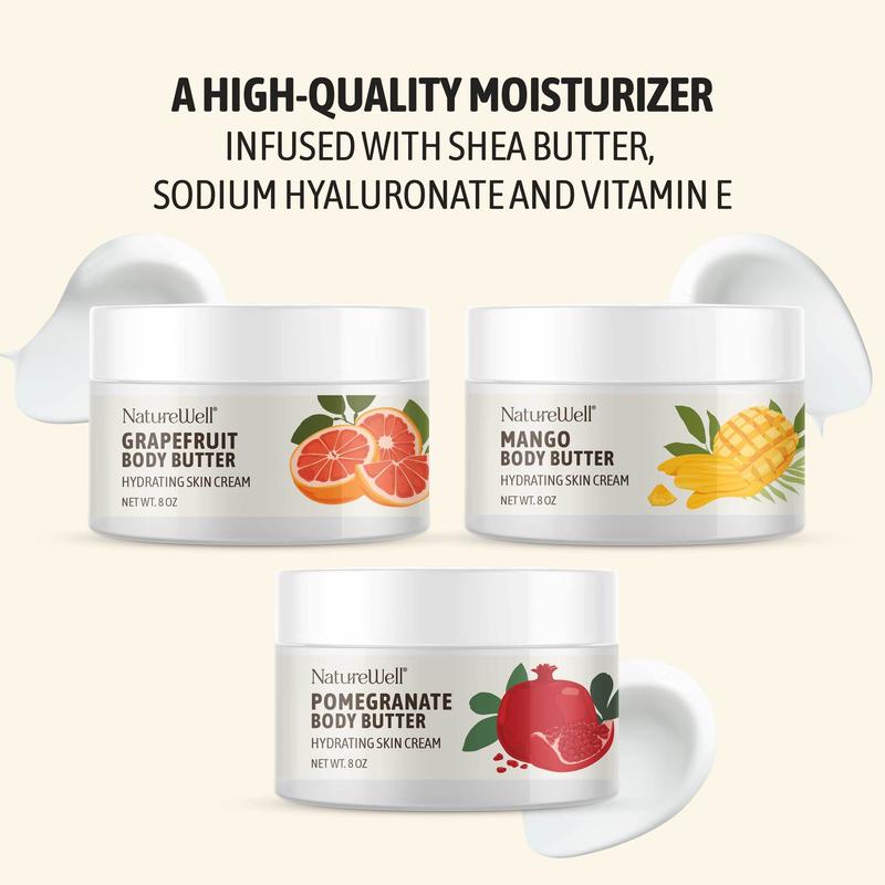 Featuring 3 luxurious, juicy-scented body butters in Mango, Grapefruit and Pomegranate. These body butters are formulated with shea butter to provide ultra hydration and feature an uplifting scent! These body butters absorb quickly while hydrating and nourishing skin, leaving it visibly softer and smoother.