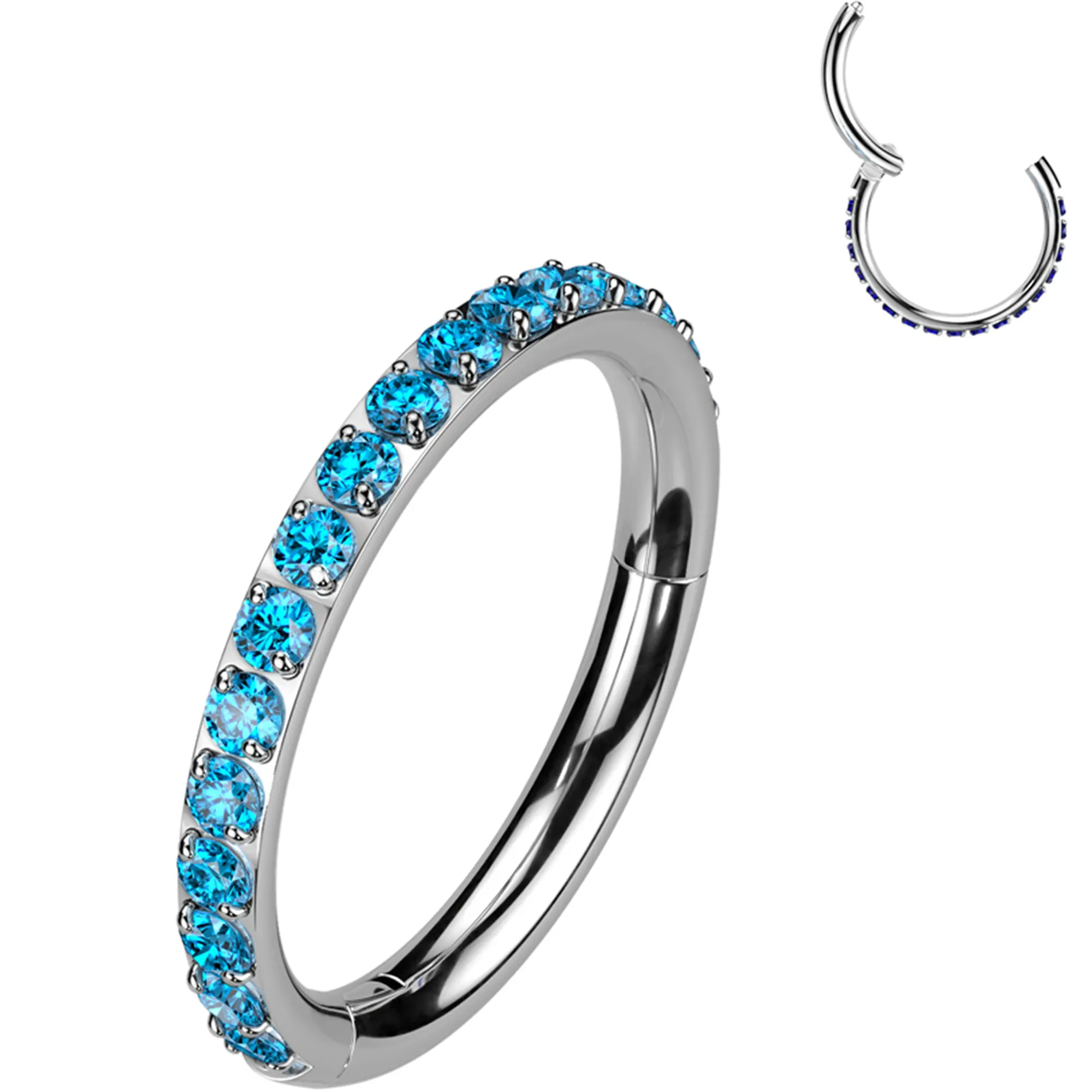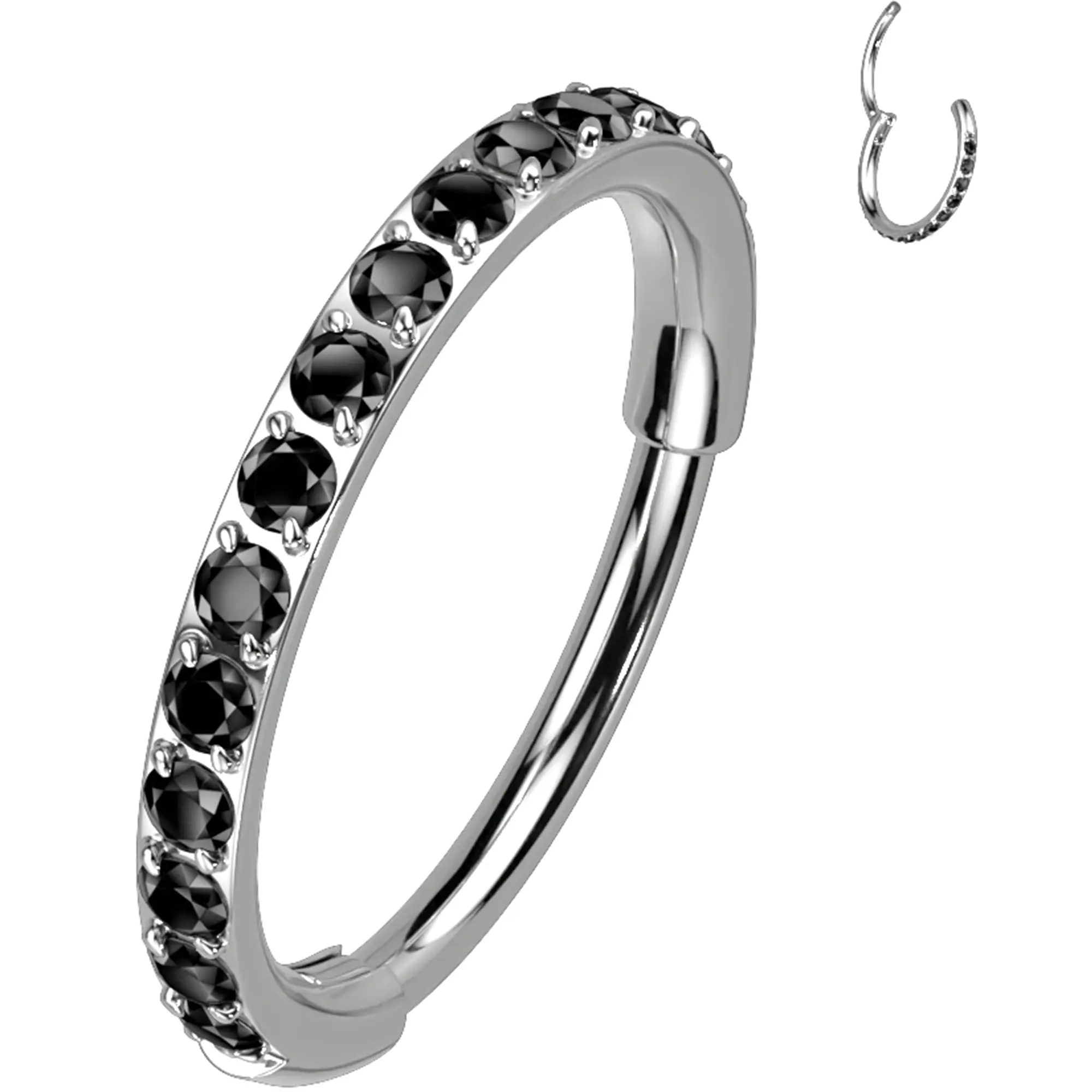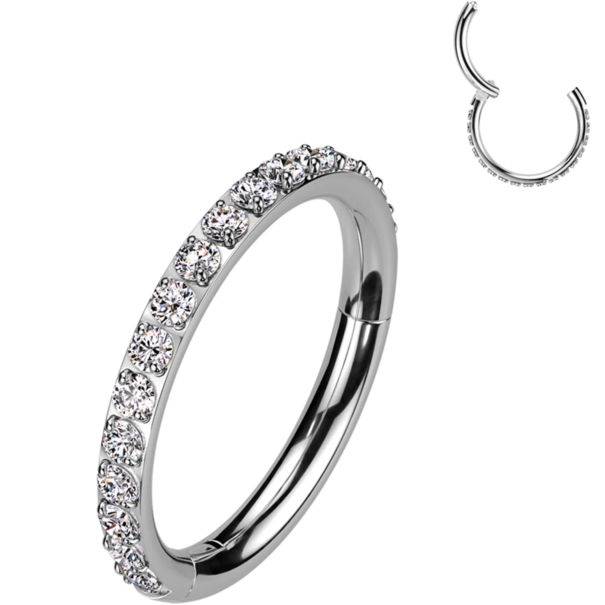 Implant grade titanium hinged nose hoop ring piercing. This micro gem nose ring features a segment hinged closure for easy insertion and removal. 18G nose ring hinged segment hoop with dazzling forward facing cubic zirconia CZ stones.