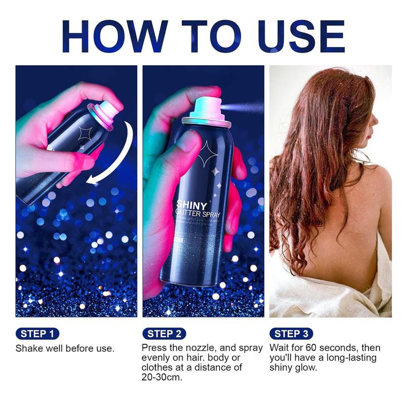 Shake well before use. Spray 20-30 cm onto hair, body, or clothes. Let it dry for 60 seconds, and the glitter will stick. Simple steps for a stunning, long-lasting look. Ready to dazzle in no time.