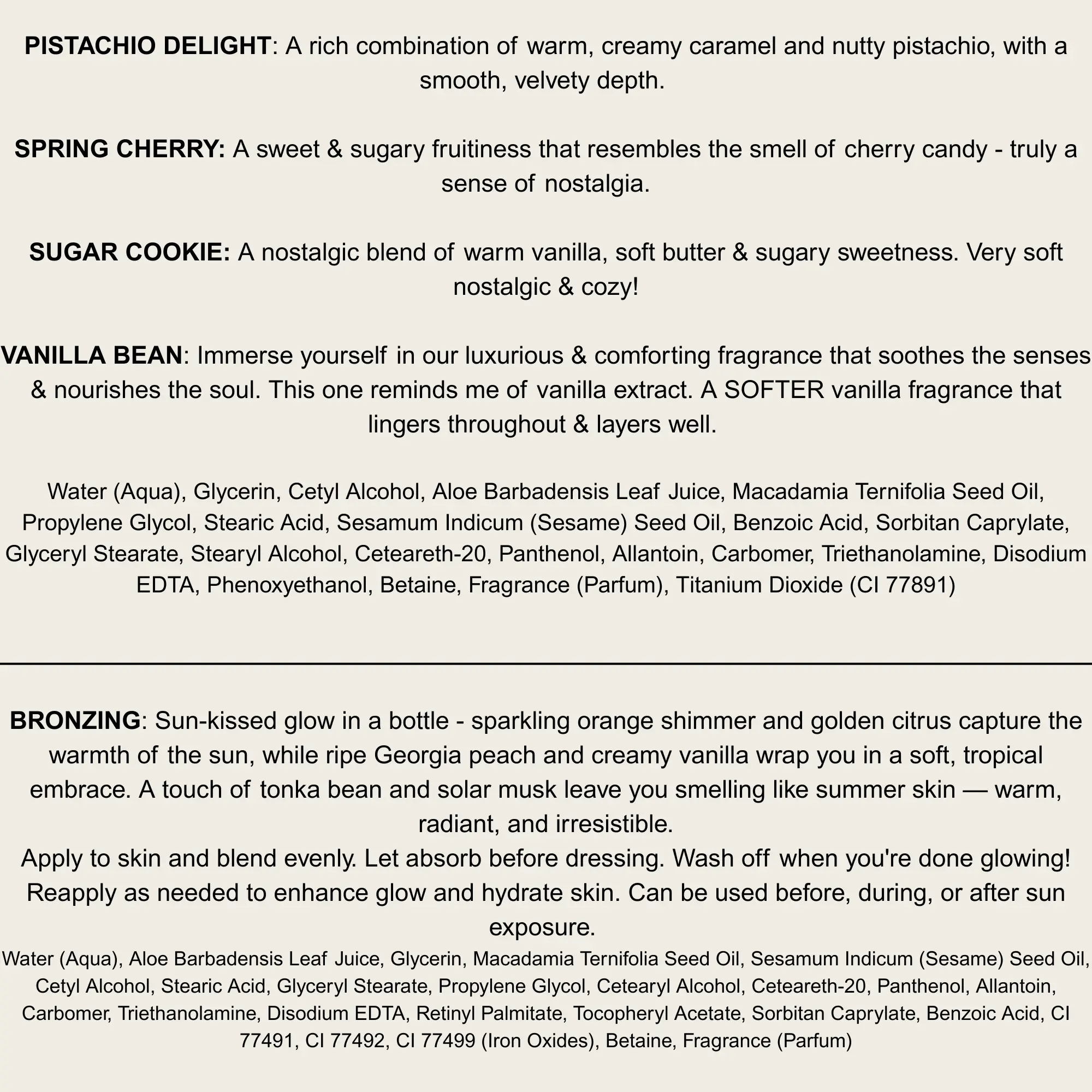 ·Vanilla Bean: a light, soft & fluffy vanilla that resembles vanilla extract (one of our lightest scents). Due to the fragrance, this product naturally darkens over time. It does not affect the product.