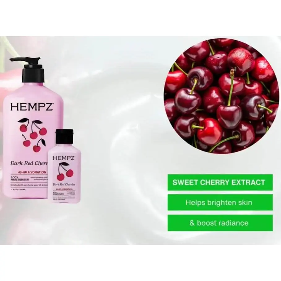 | Ingredients | Water/Aqua/Eau, Isopropyl Palmitate, Butylene Glycol, Propanediol, Fragrance (Parfum), Glycerin, Butyrospermum Parkii (Shea) Butter, Dimethicone, Sorbitan Stearate, Stearic Acid, Glyceryl Stearate, PEG-100 Stearate, Cannabis Sativa Seed Oil, Aloe Barbadensis Leaf Juice, Prunus Avium (Sweet Cherry) Fruit Extract, Tocopheryl Acetate, Panthenol, Phenoxyethanol, Cetyl Alcohol, Polysorbate 40, Nylon-12, Carbomer, Chlorphenesin, Ethylhexylglycerin, Aminomethyl Propanol, Trisodium Ethylenediamine Disuccinate, Coumarin, Hydroxycitronellal, Benzyl Benzoate, Linalool, Citronellol, Limonene, Alpha-Isomethyl Ionone, Red 40 (CI 16035), Ascorbic Acid, Citric Acid, Potassium Sorbate, Sodium Benzoate |