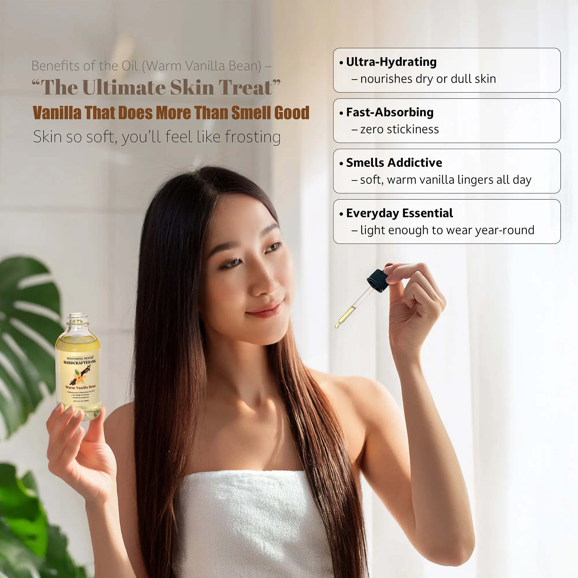 I loveeee this oil my second time buying the Warm Vanilla Bean and it smells so delicious leaves me feeling so soft and smelling like Vanilla all day long I can’t wait to try them all