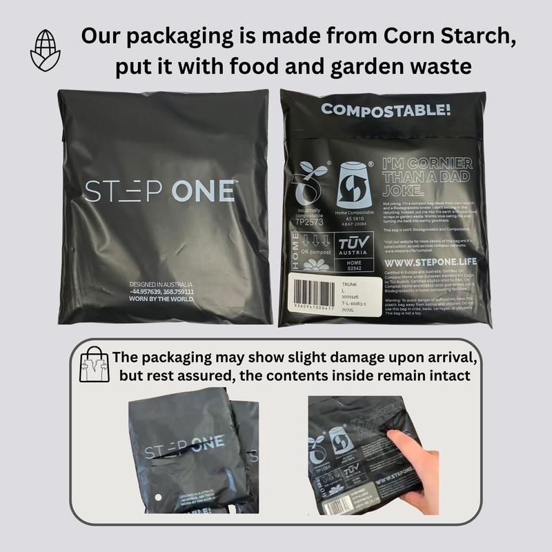 Our packaging is made from Corn Starch put it with food and garden waste.