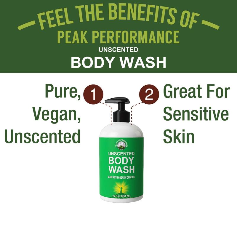 ·One of the Only Body Washes Made With Organic Ingredients! Don’t be fooled by cheap body washes that use non organic ingredients that have been sprayed with chemicals. Many body washes contain propellants, chemical detergents, and other ingredients that are harmful for your skin and overall health. Peak Performance Body Wash is pure, vegan, unscented, natural and is chemical free. Great for sensitive skin!