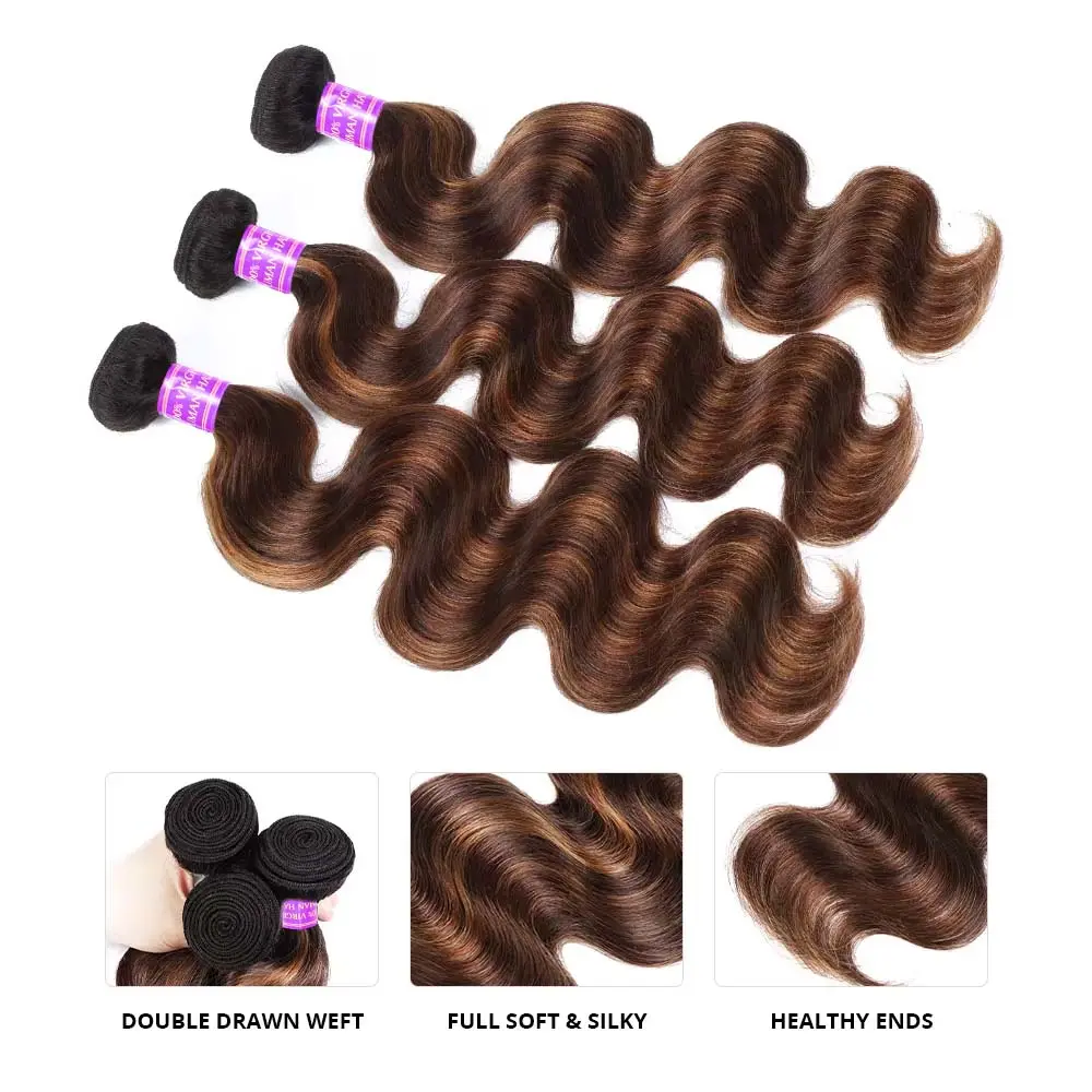 I absolutely love these brown highlight body wave bundles! The quality is amazing ā the hair is soft, silky, and has a natural shine that gives it a healthy, luxurious look.