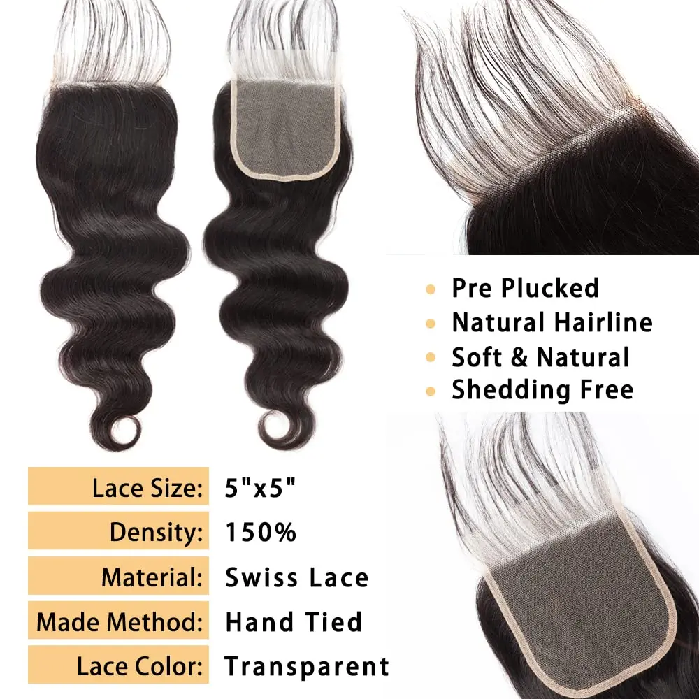 Hair Feature:5x5 HD Lace Closure with Bundles, Pre Plucked Natural Hairline