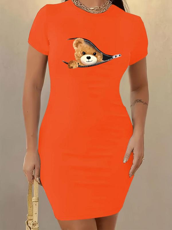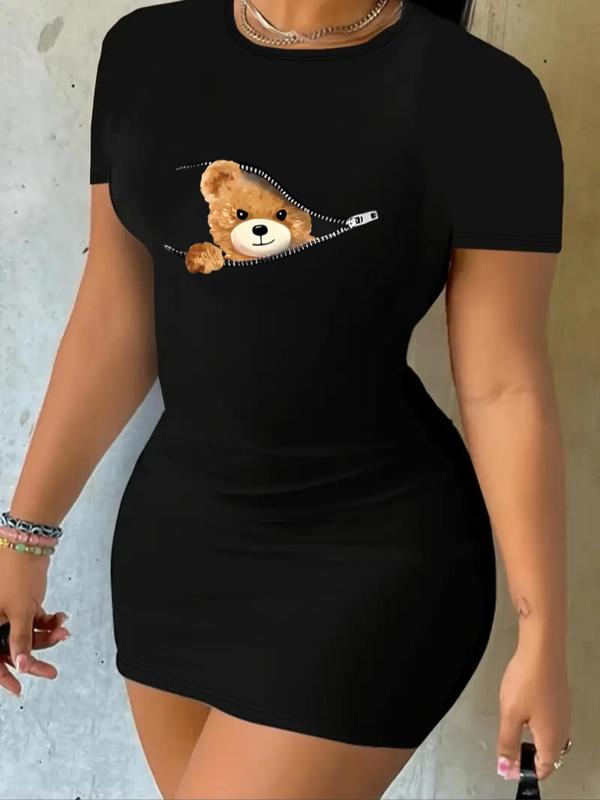 Women's Cartoon Bear Print Round Neck Bodycon Dress, Cute Casual Short Sleeve Dress for Daily Outdoor Wear, Ladies Clothes for All Seasons