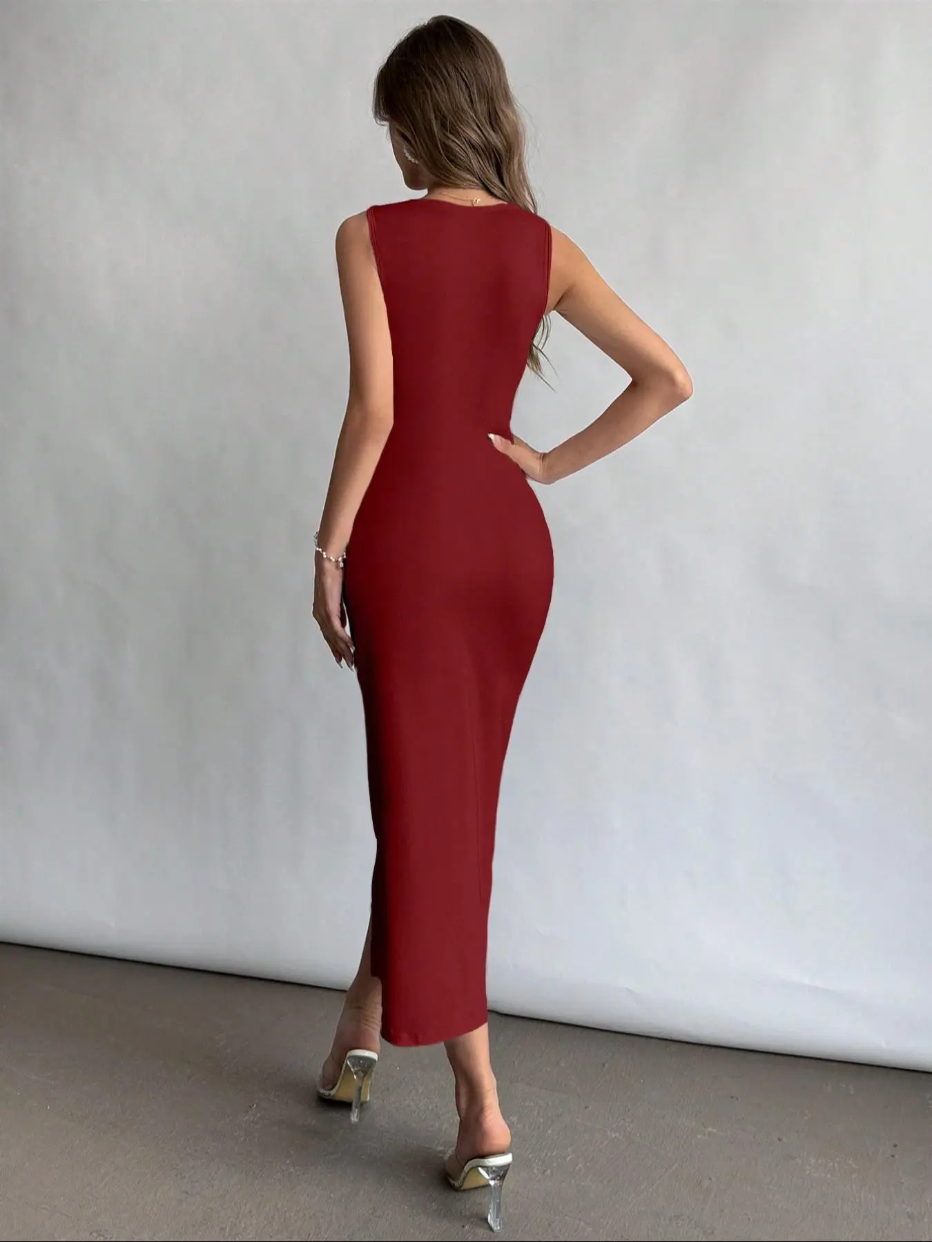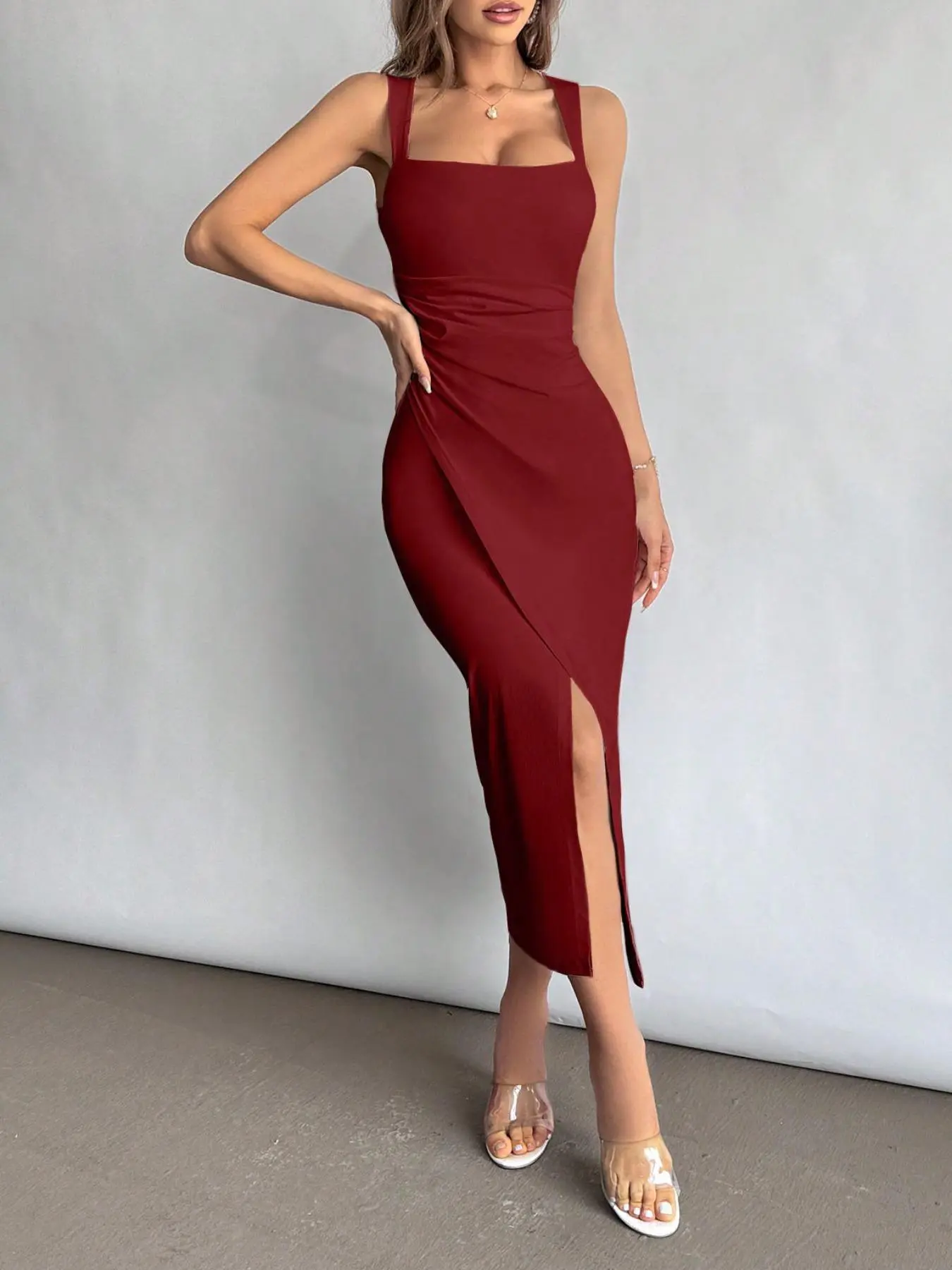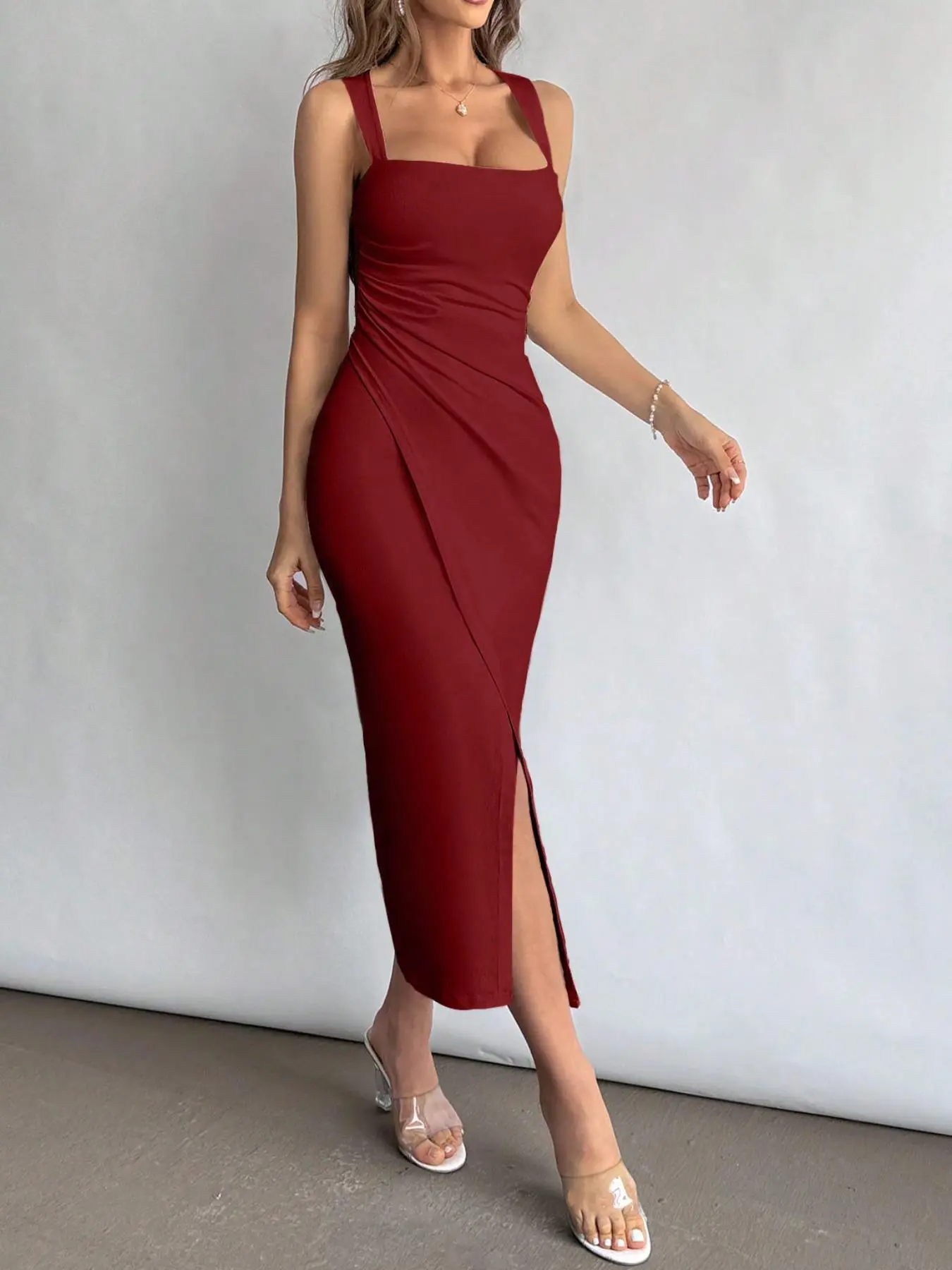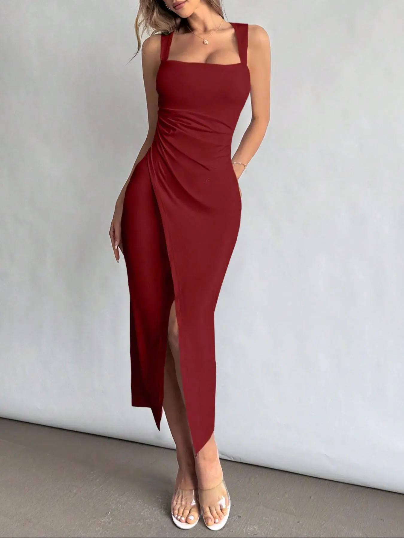 Burgundy Square-Neck Ruched Slit Maxi Dress? Bold Valentine’s Chic Unlocked#ValentinesDay #EveningWear #GlamorousEnsemble #RomanticVibe
