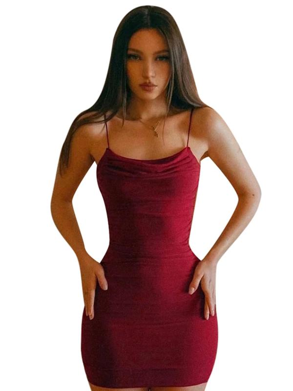 Women's Solid Backless Ruched Bodycon Dress, Fashion Casual Spaghetti Strap Cami Dress for Daily Outdoor Wear, Ladies Clothes for All Seasons