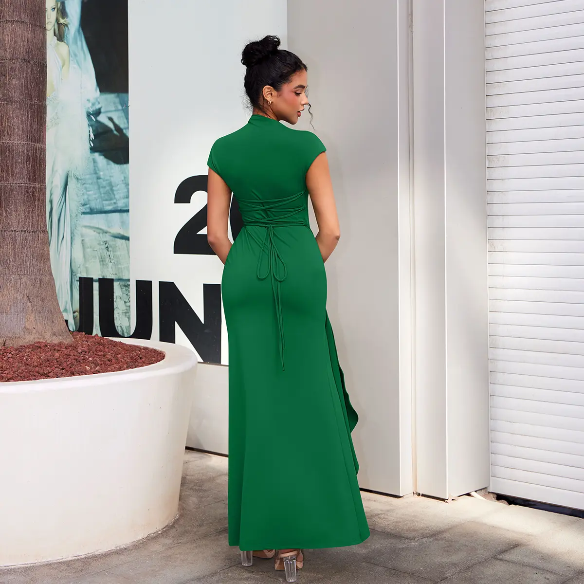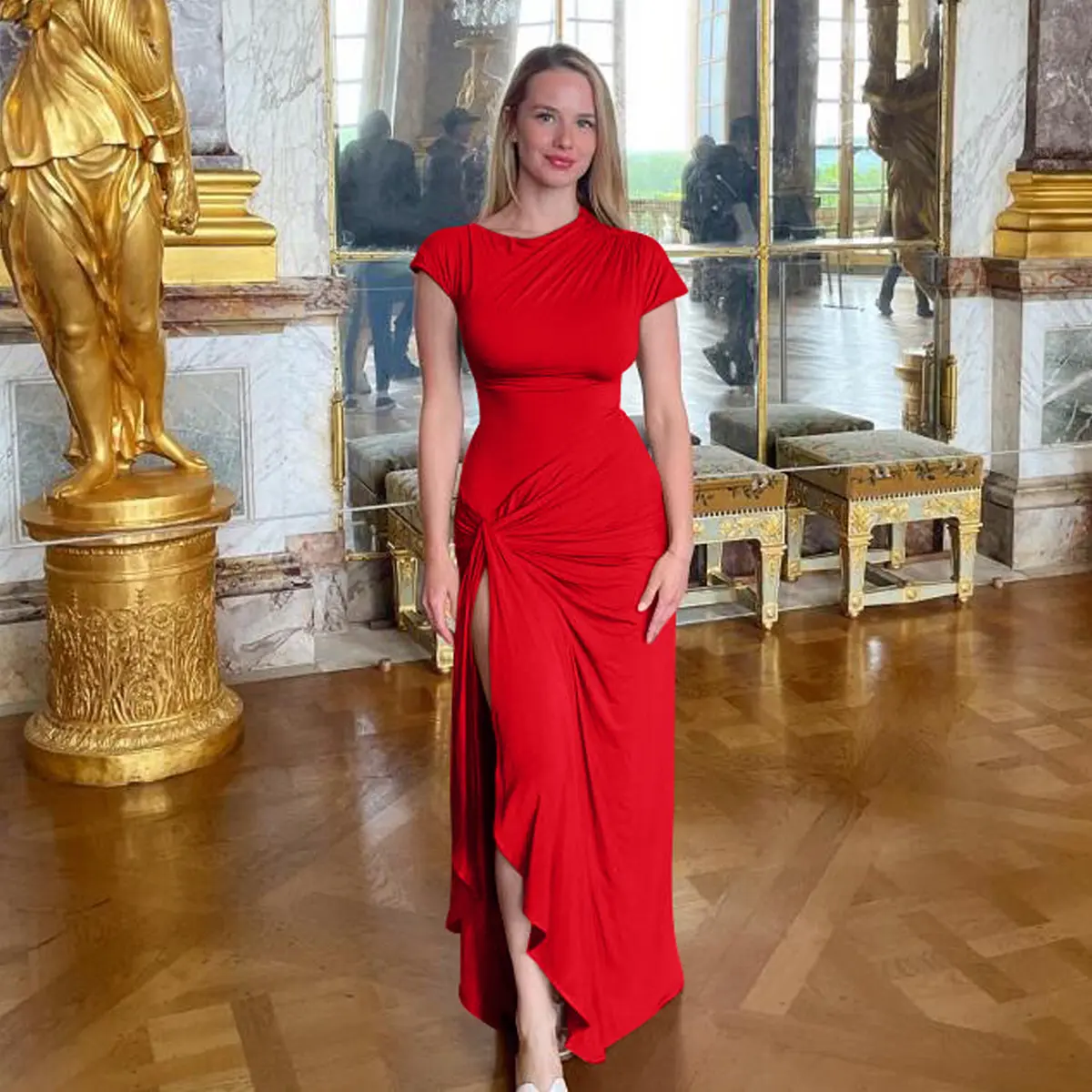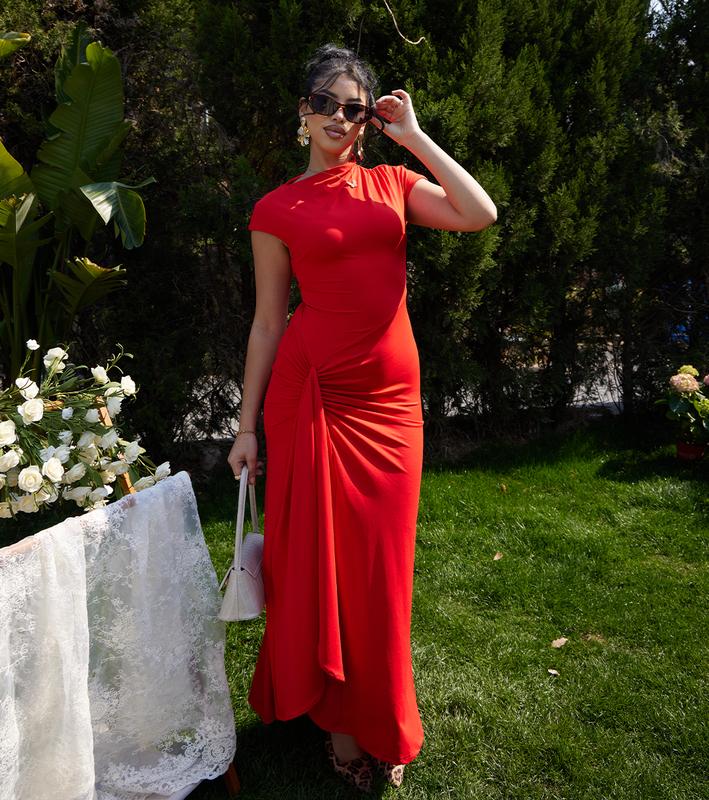 This women's high split ruched maxi dress features a boat neck, short sleeves, and a slim fit. The lace-up waist cinches in, showcasing your hips. The twisting front waist design complements your figure beautifully. The side high split highlights your slender legs, offering cool airflow. This trendy dress will make you stand out at any event.