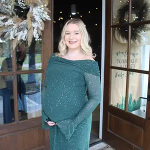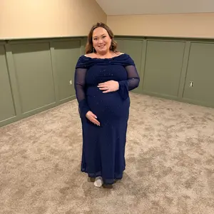 I absolutely love, love, LOVE, this dress!! I am currently 28 wks pregnant and it looked GORGEOUS. Before pregnancy I was a size S, so I went up a size and got a M and it fit perfectly! The only thing I will say is the Burgundy is less of a burgundy in person, but all in all it is perfect ☺️