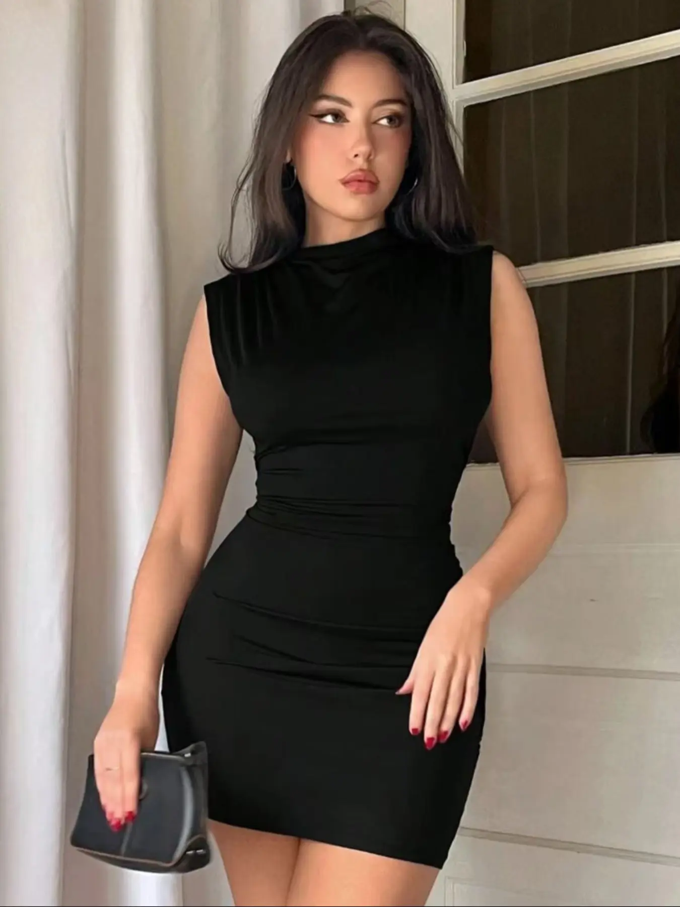 Women's Womenswear Solid Color Mock Neck Bodycon Fit Dress, Elegant Aesthetic Fashion Casual Sleeveless Short Dress for Daily Outdoor Wear, Women Dress for Summer