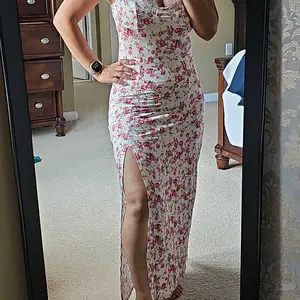 I LOVE this dress!! Nice stretchy material, hugs your body in the best comfortable way. has adjustable straps. It’s a tiny bit see-thru but only if you wear bright colored undergarments. For reference I’m 5’3 and weigh 130lb. I would say tho, if you have a bigger chest they might spill out the dress