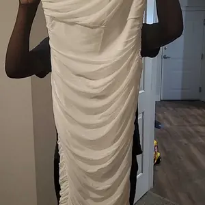 Gorgeous dress! Best way to put It on is to step into it and pull it up! This dress is so classy and sexy. The material is amazing. The ruching is beautiful, which makes it versatile. It can be worn as a long or a short dress.