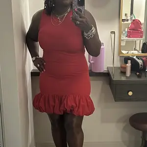 Cute dress. Bought it for an event but wore something different. Material is thick yet stretchy. Material gives fitted tank top vibes. Definitely should fluff out the bottom. Bought a medium, could’ve gotten a large as well. I’m 5’0, 155 lbs, 38C.