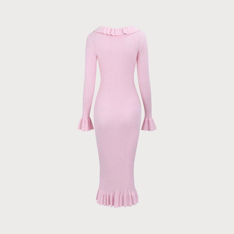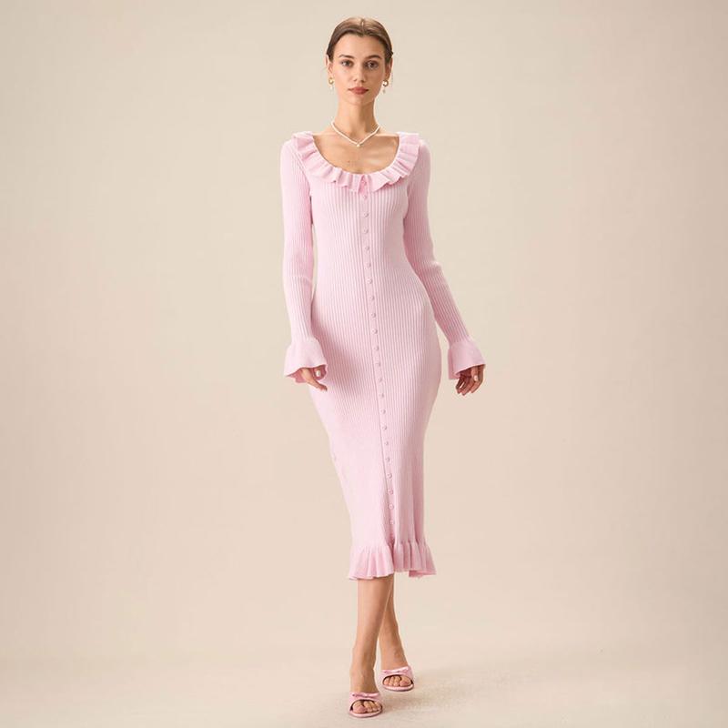 Made from a soft, stretchy fabric, it hugs your curves while offering comfort and warmth. The feminine U-neckline is accentuated by playful ruffles, adding a chic, romantic touch. Perfect for day-to-night transitions, this bodycon dress enhances your silhouette while maintaining a sophisticated look.