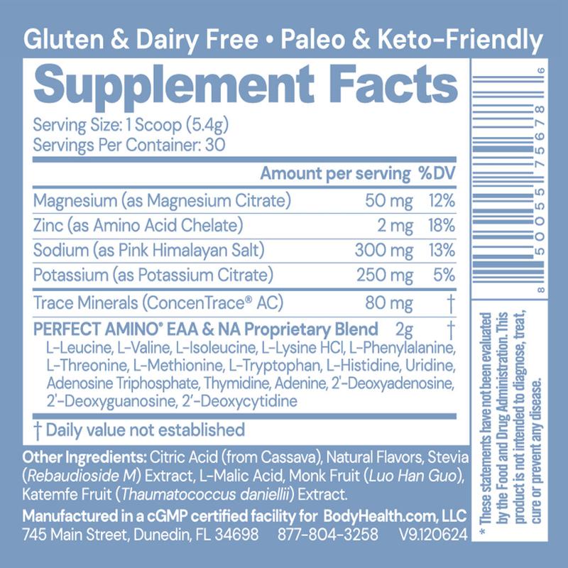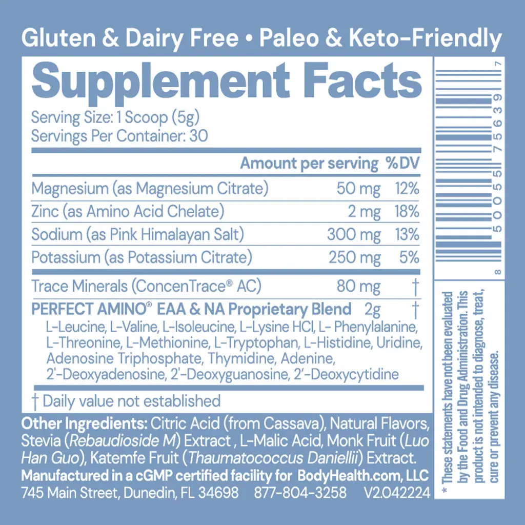 PERFECT AMINO® Electrolytes are designed for complete intracellular absorption. They enhance hydration, aiding cell recovery and peak efficiency. Essential amino acids are added for optimal electrolyte utilization. Each serving includes 2g of PERFECT AMINO®. This ensures your cells receive the necessary nutrients for maximum benefit.