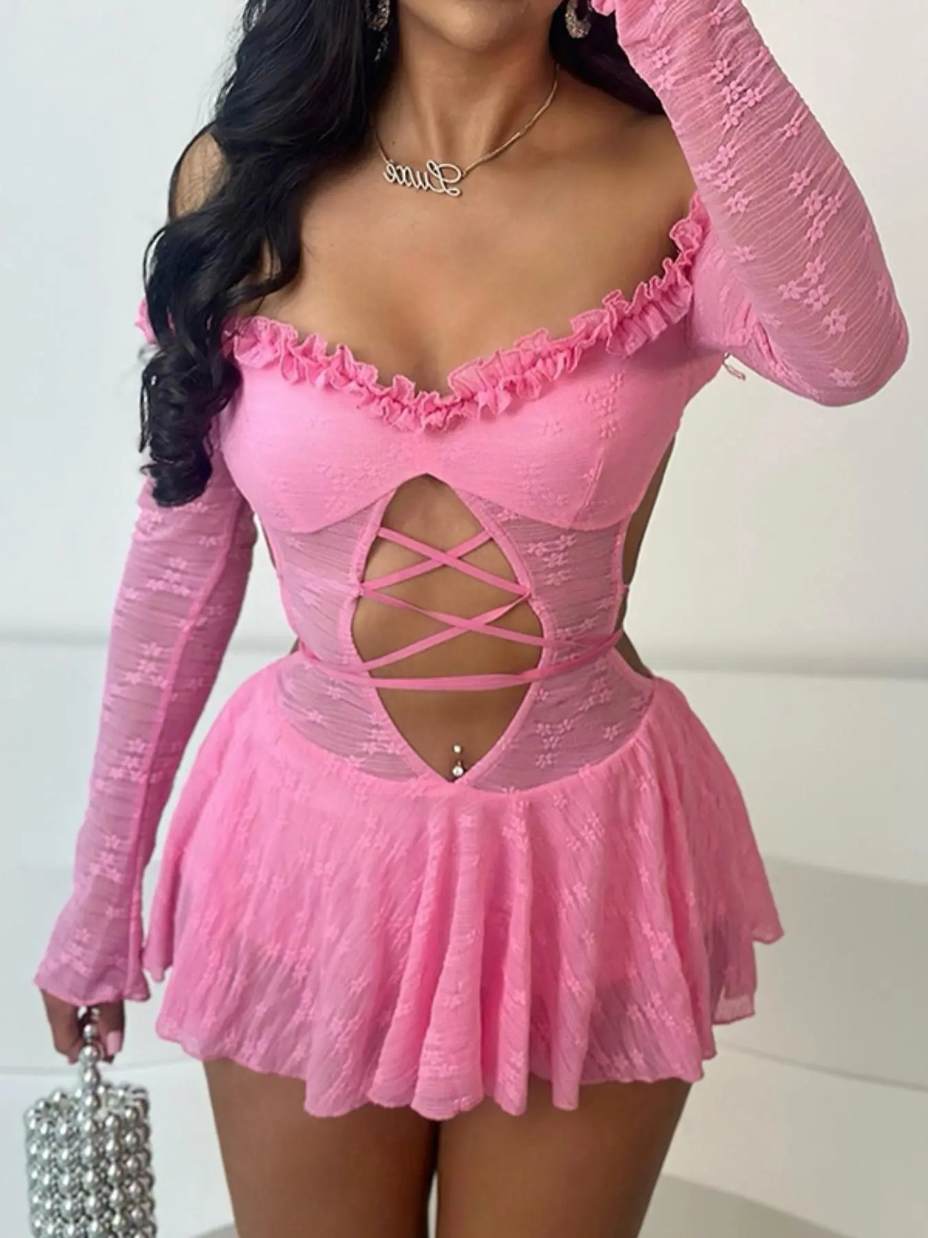 Women's Contrast Mesh Sheer Backless Off Shoulder Cut Out Bodysuit, Sexy Fashion Frill Trim Tie Back Long Sleeve Bodysuit for Nightclub Music Festival, Women's Clothes for Spring & Fall