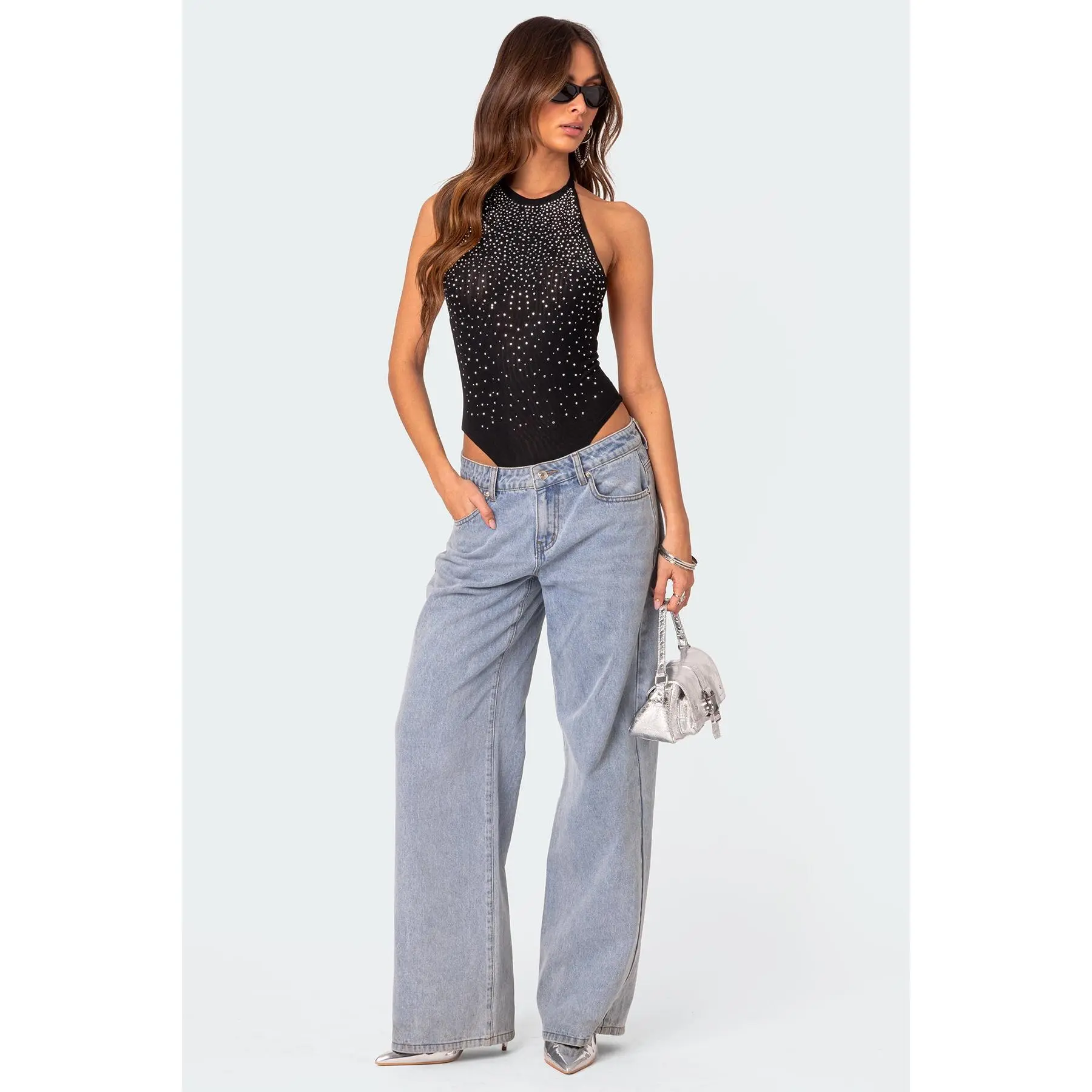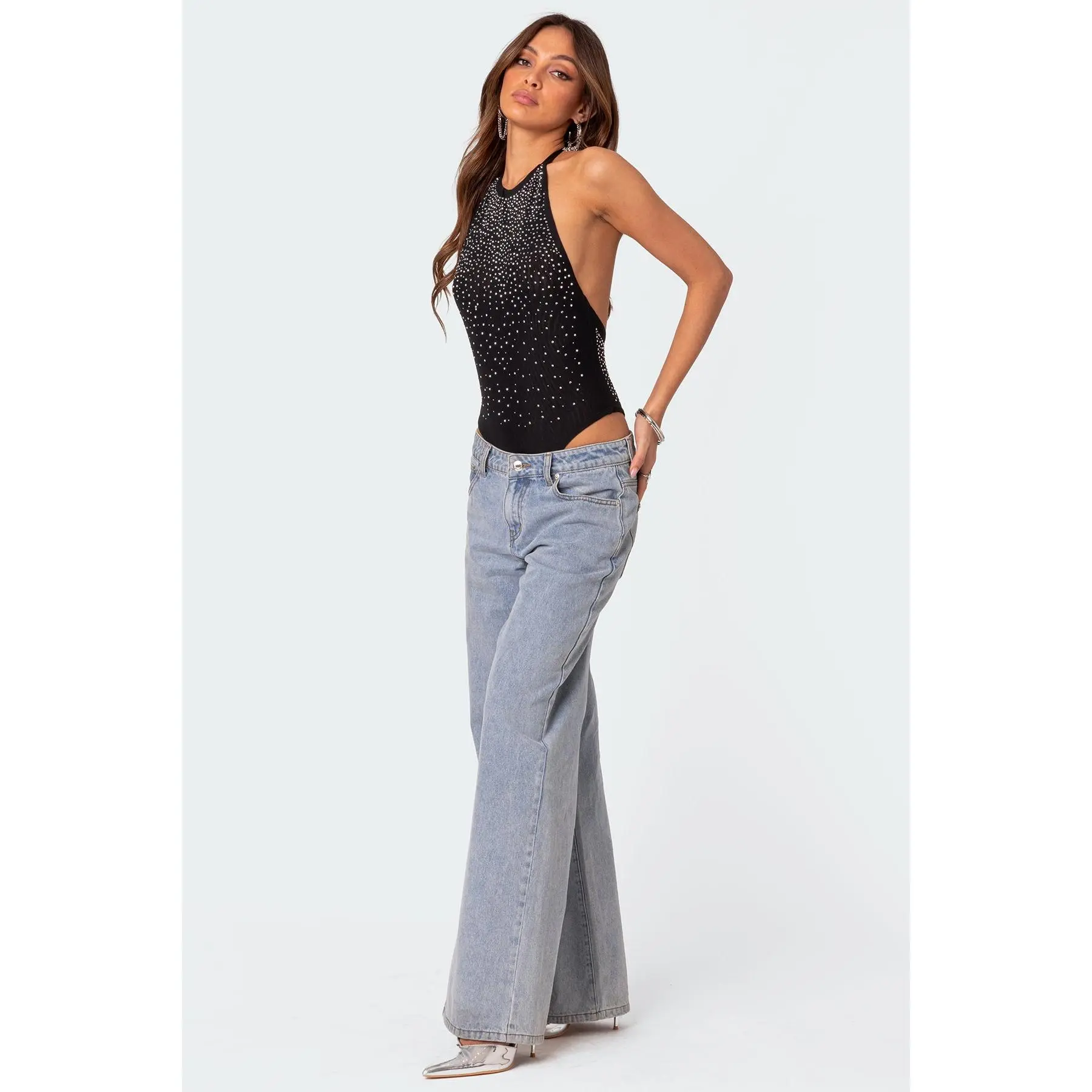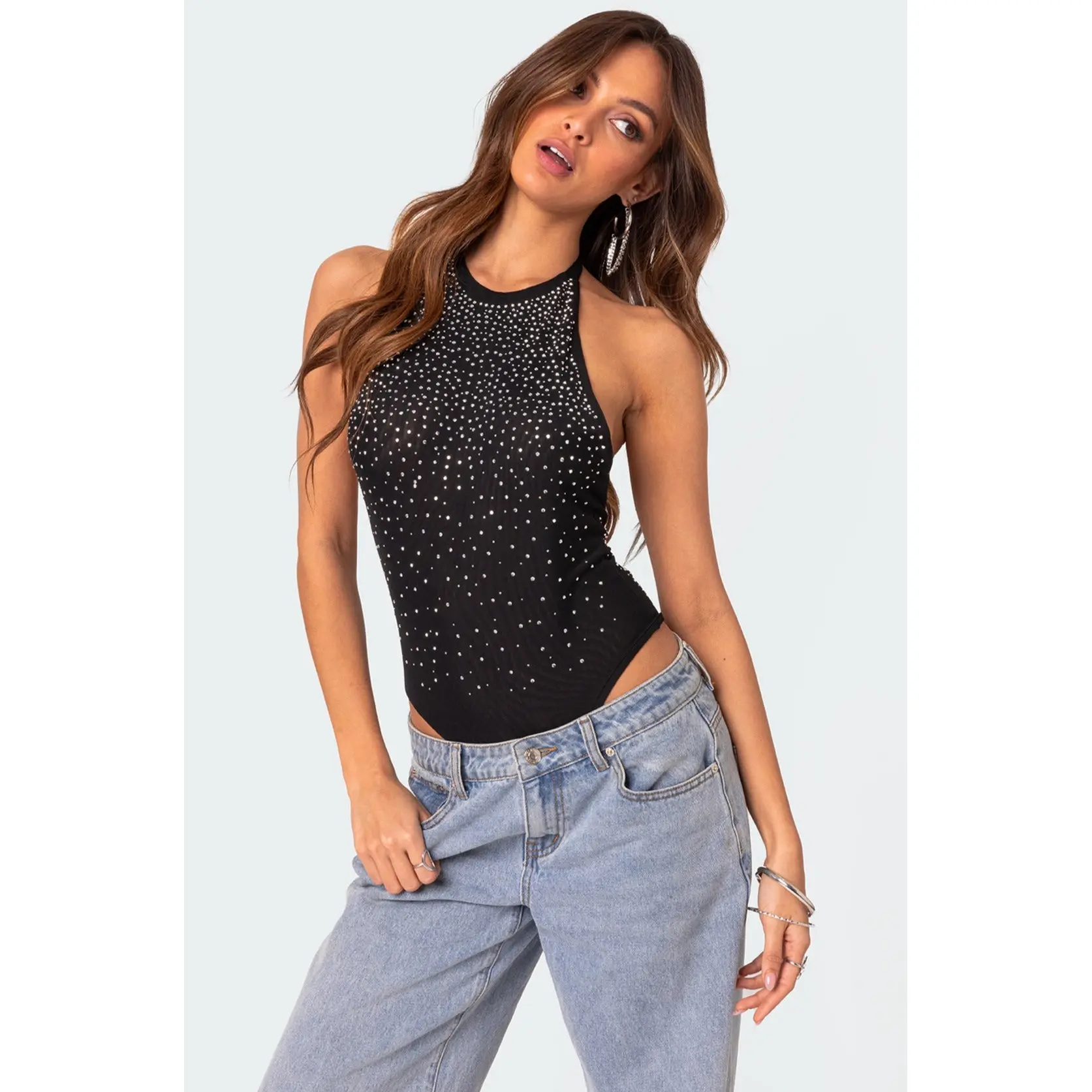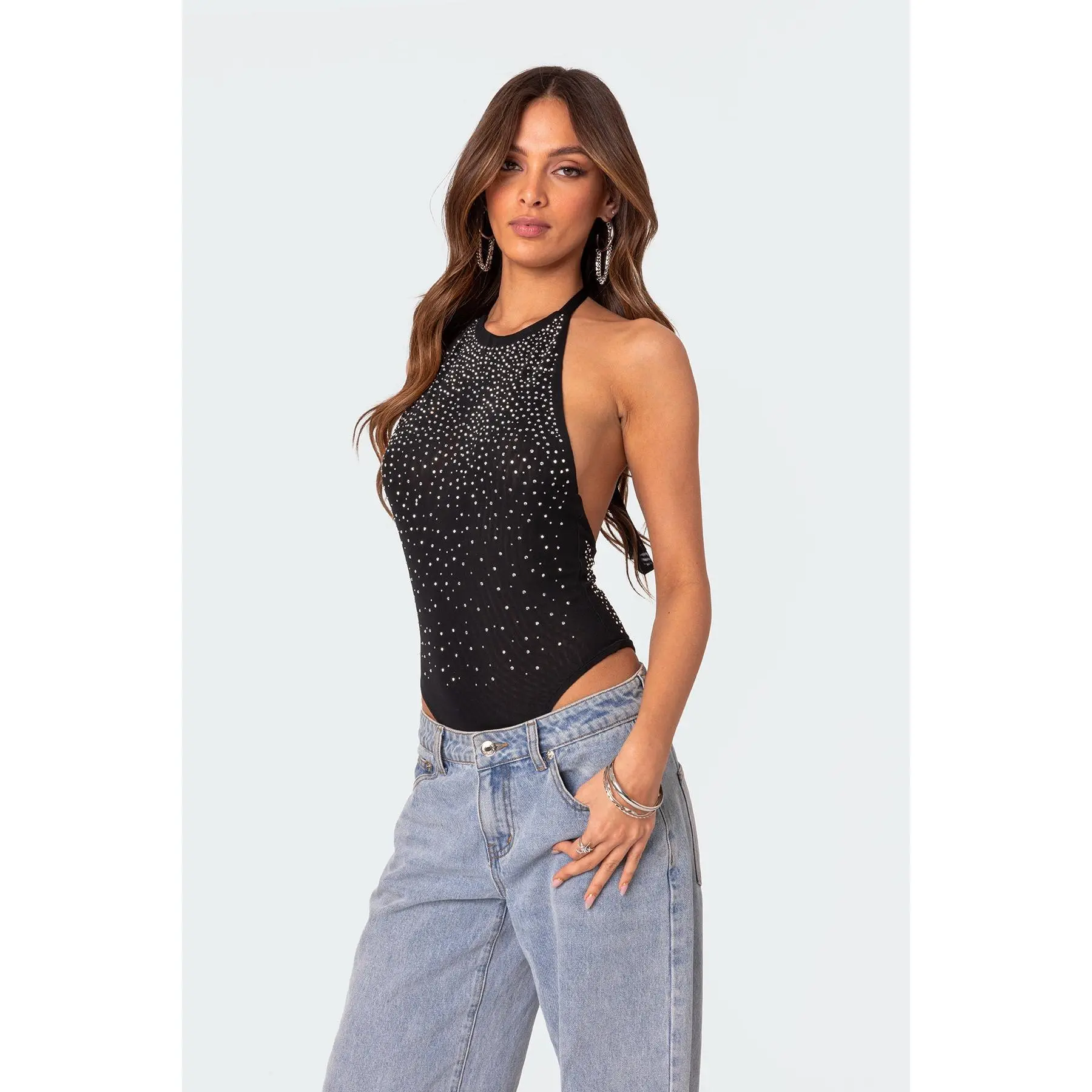 Edikted Women's Halter Open-Back Mesh Rhinestone Bodysuit, Spandex Fabric Womenswear Top