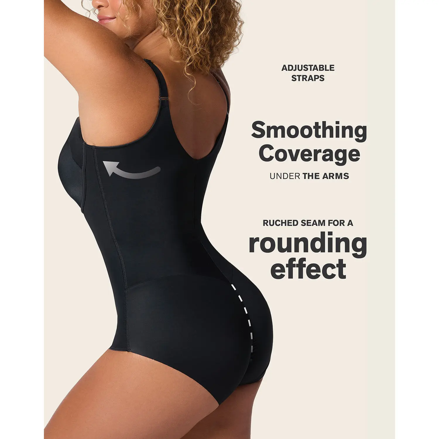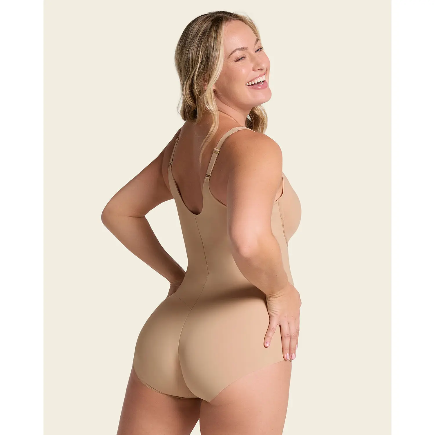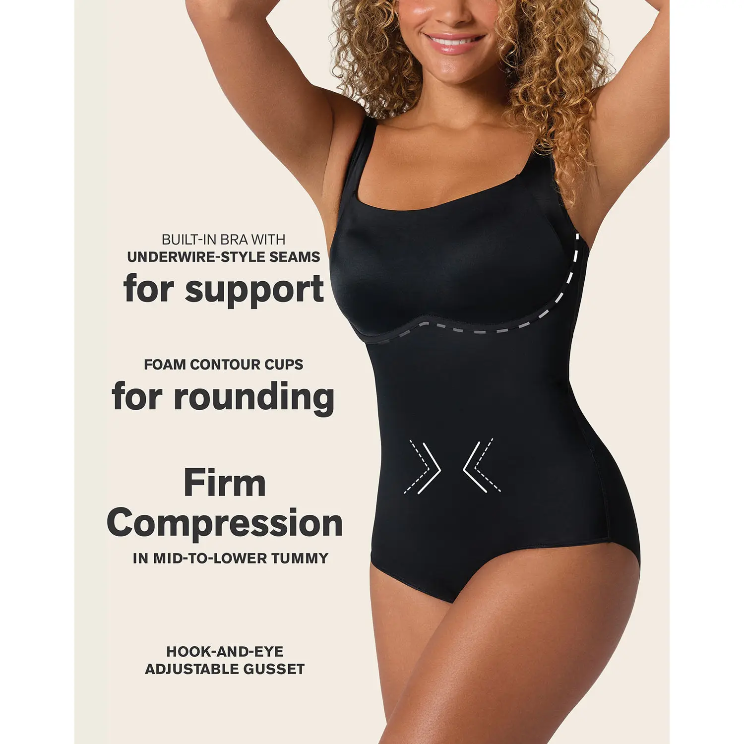An all-in-one bodysuit that can be worn as shapewear or daily wear! It has a supportive built-in bra with double-layered fabric cups with foam inside for rounding. It's wireless and has excellent coverage under the arms for smoothing. The straps are adjustable for a perfect fit. The lower half is made of our signature DuraFit® fabric, which is super cool and soft to the touch, plus it sculpts your curves. The hipster-style bottom has no elasticated leg bands, so it won't show under clothes, plus it has a ruched center seam for a natural butt rounding effect. The cotton-lined 4-level adjustable hook-and-eye gusset makes this shaper easy and comfortable to wear.
