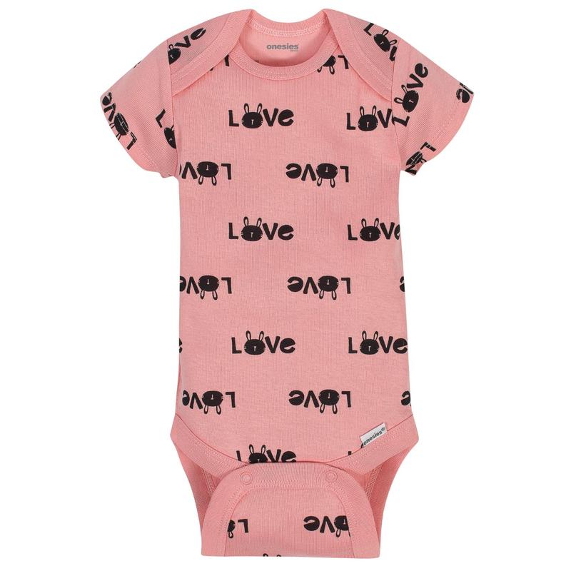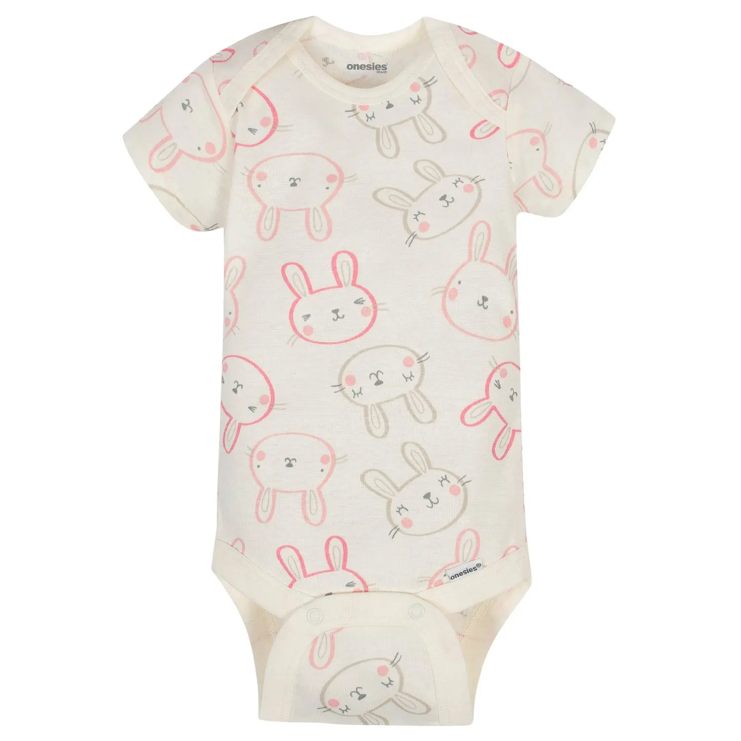 Our baby girls' Onesies® Brand bodysuits are essential to baby! These adorable, assorted Onesies® Brand bodysuits are made with a soft cotton fabric that’s perfectly comfortable against baby’s delicate skin. Baby will love how breathable this material is! This pack includes eight bodysuits decorated in bunny themed prints. Perfect for Springtime and Easter. These Onesies® Brand bodysuits are an excellent choice for any baby girl!