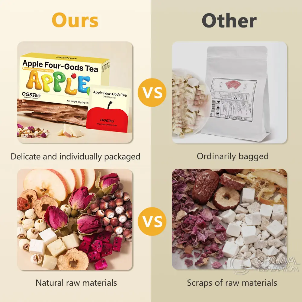 Discover the Apple Four God Tea, a delightful blend of 80g (8g x 10 packs). This tea features a harmonious mix of Lotus Seed, Pear, Apple, Rose, Chine Yam, Poria Cocos, Gorgon Fruit, Dragon Fruit, and Hawberry. Each pack offers a unique taste experience, perfect for tea enthusiasts.