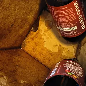 One bottle arrived in tact, the other bottles bottom looks like it was cut off with a laser. Bottle 2 of 2 arrived completely empty w/ the box soaking wet. Delived in plastic bag as box was wet...