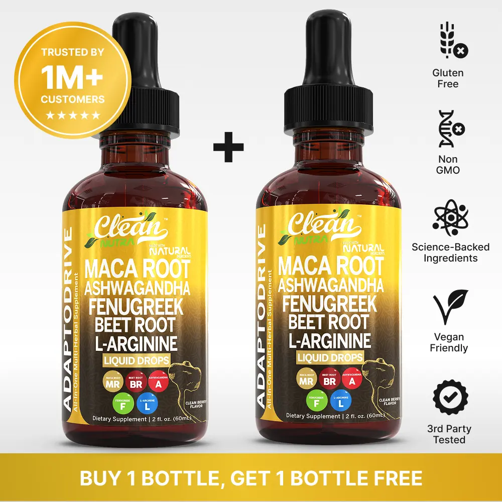Adapto Drive by Clean Nutra offers a powerful liquid multivitamin supplement infused with Organic Maca Root, Ashwagandha, Organic Fenugreek, Organic Beet Root, and L-Arginine for both women and men.