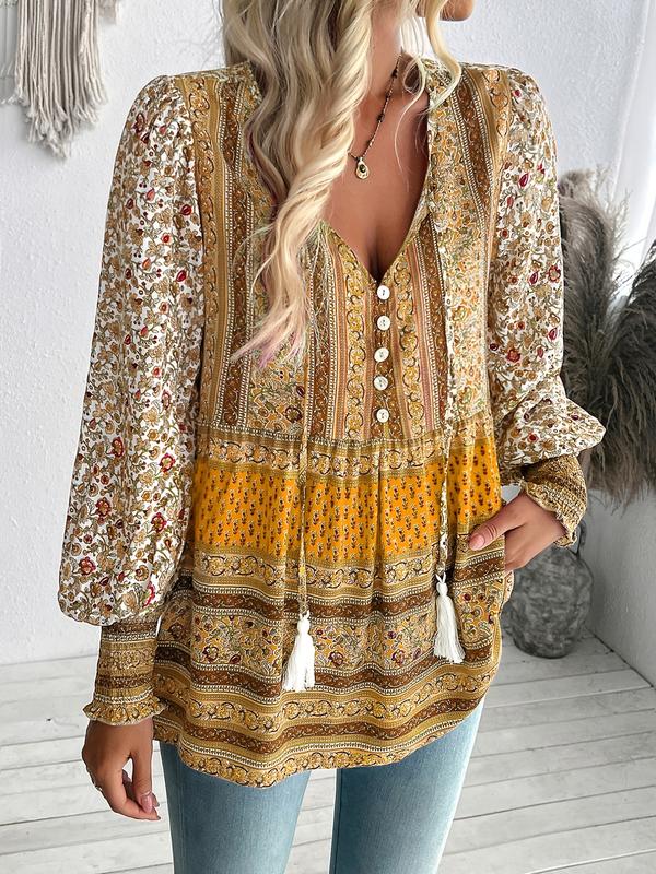 ZAFUL Bohemian Print Long Sleeve Loose Casual Women's Shirt Top with Lace-up Pendant Tassel Ethnic Womenswear Mixed Color Fitted Blouse