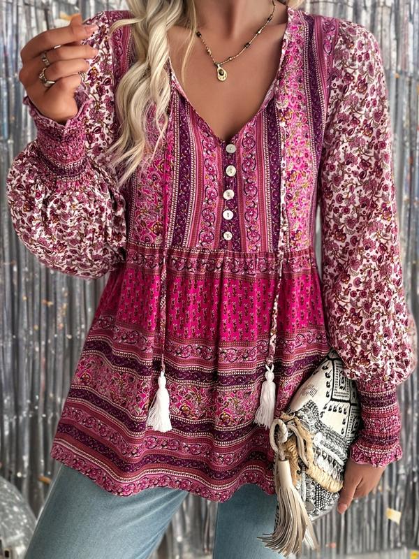 5. ZAFUL Bohemian Print Long Sleeve Loose Casual Women's Shirt Top with Lace-up Pendant Tassel Ethnic Womenswear Mixed Color Fitted Blouse