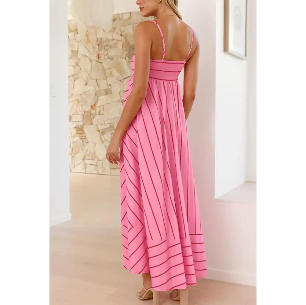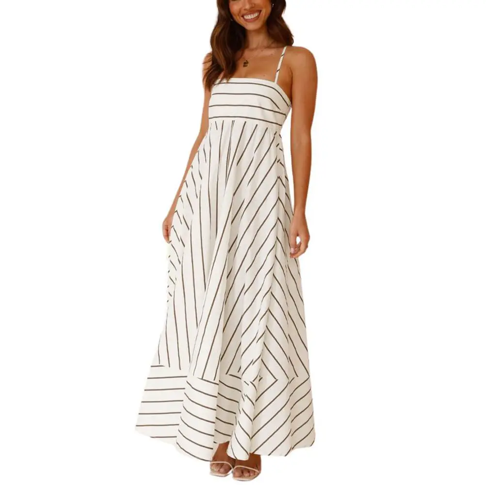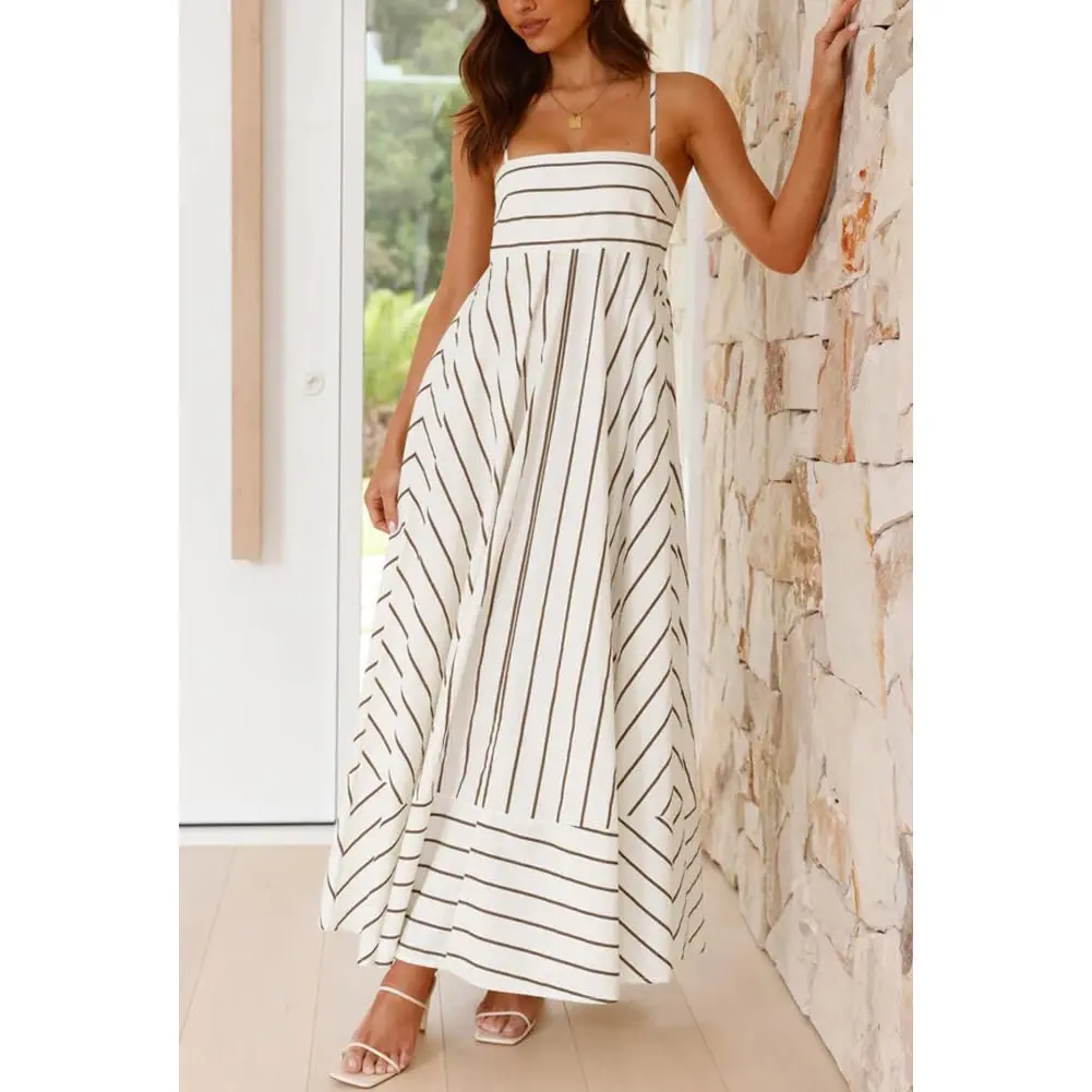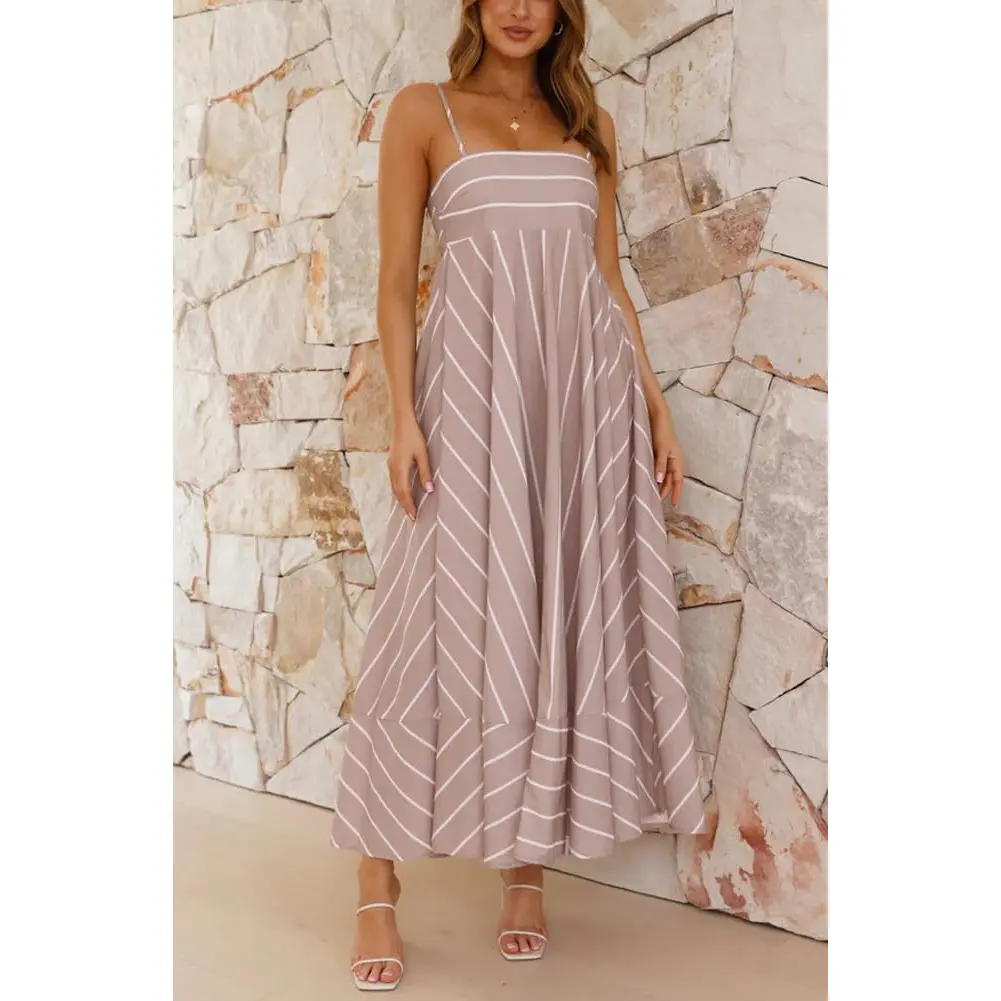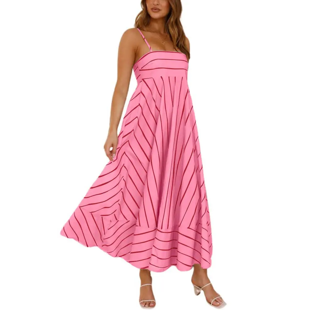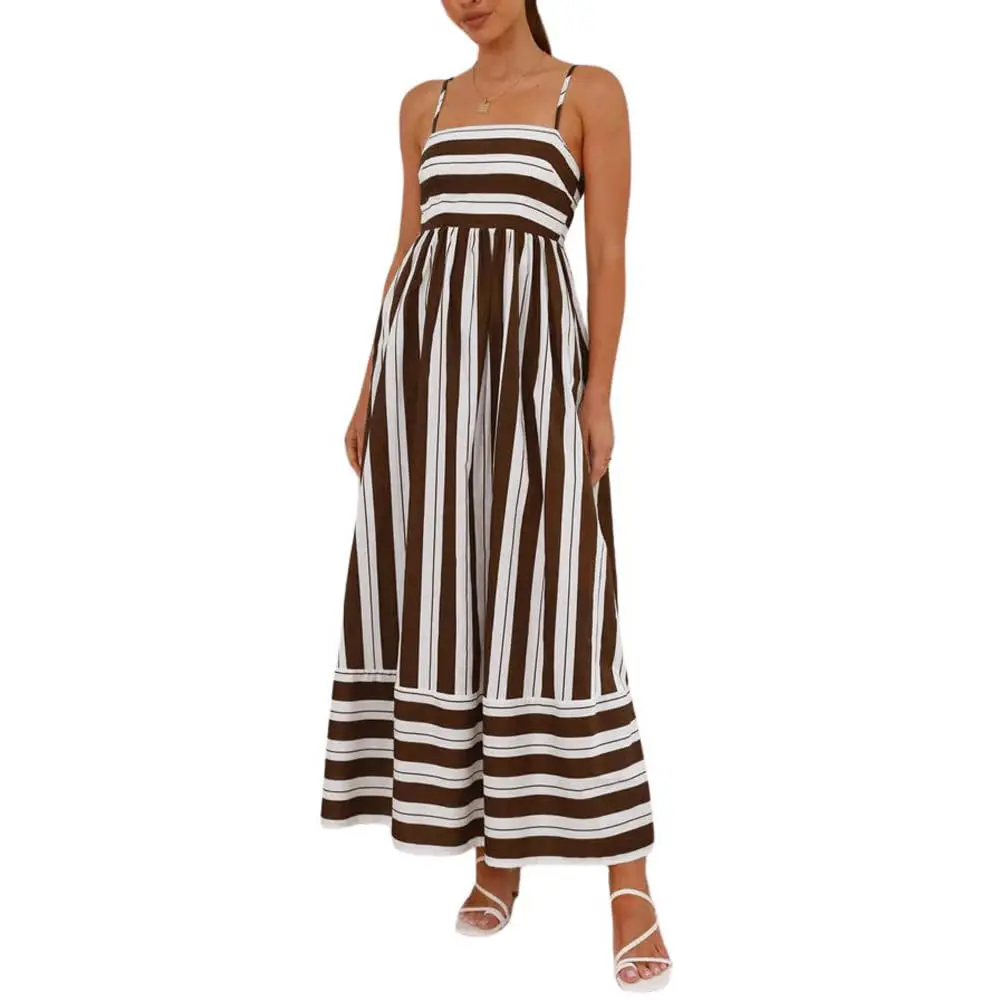 Β·Summer boho sleeveless dress for women, featuring color block striped pattern, stretch smocked design at back, adjustable spaghetti strap over shoulder, a-line flared silhouette, flowy swing hem, below the knee length.