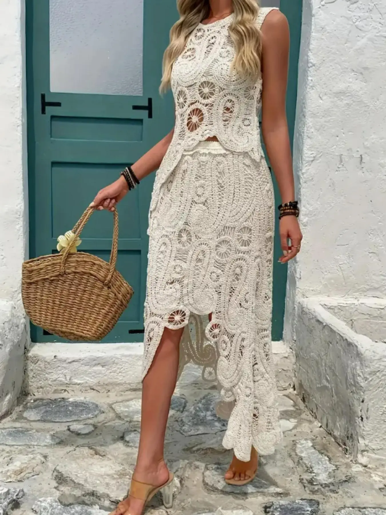 Bohemian Women's Sleeveless Fitted Top and Skirt Set, Elegant Lace Design for Beach Vacation and Music Festival, Perfect Summer Clothes