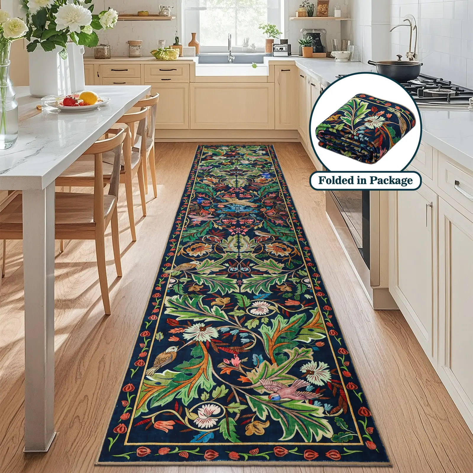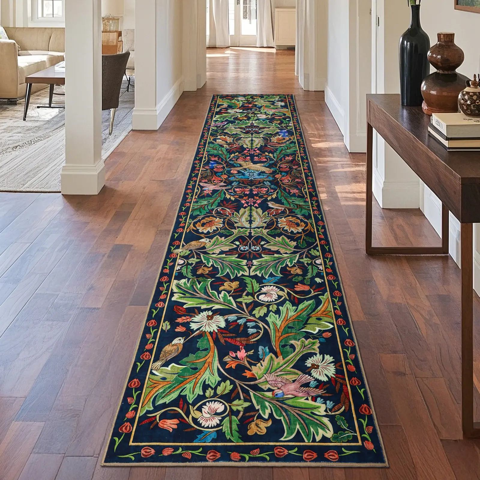 Add charm to your space with our beautiful boho runner rug. It features a unique bird and flower pattern, enhancing any room. Available in various colors and sizes, it matches any home's style and needs. Ideal for high-traffic areas like living rooms, bedrooms, and hallways.