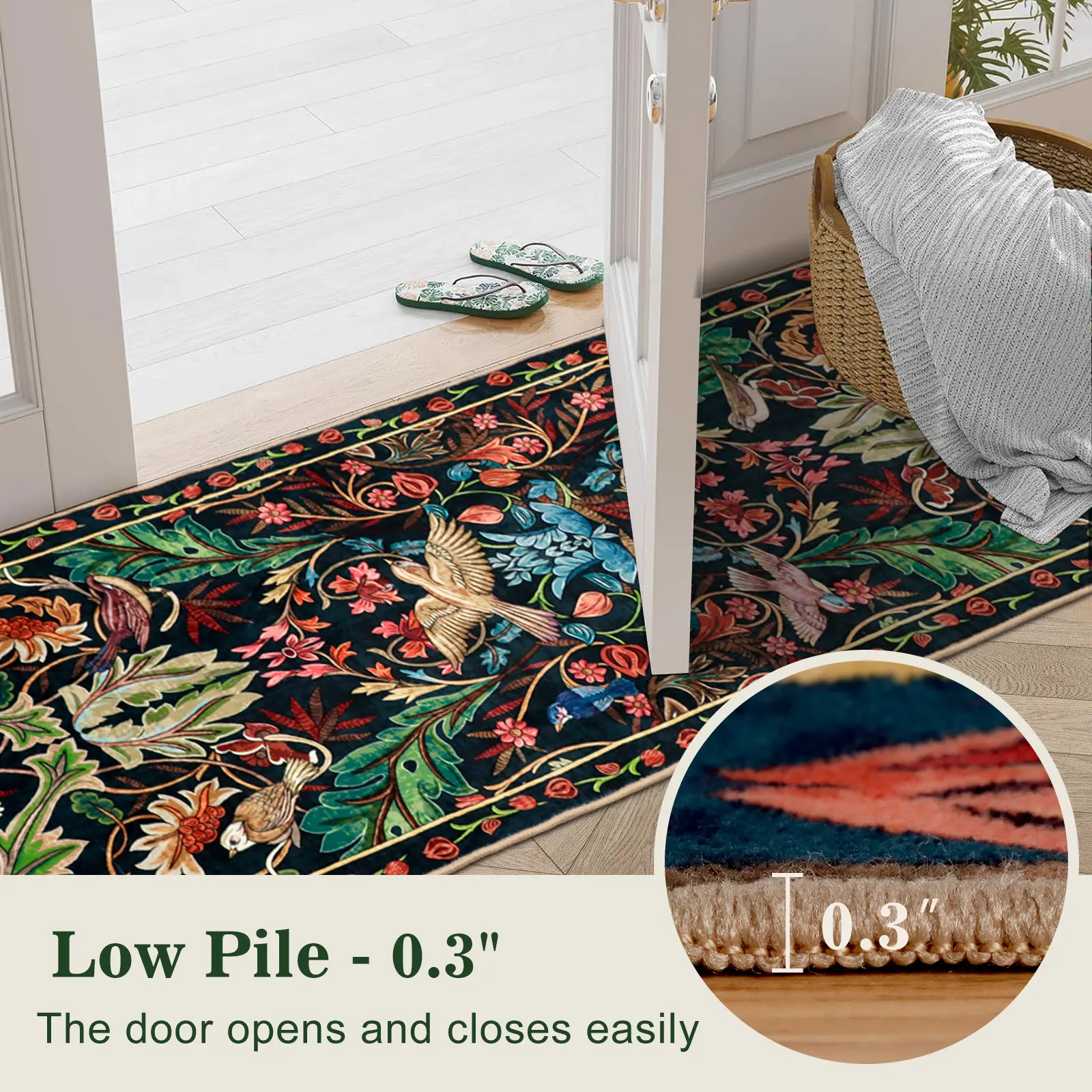 Q: Is it thin? A: The rugs are especially designed to be low-pile, so that they can be easily machine washable and won't obstruct your doors if they are put on the entryway, and won't accumulate stains.