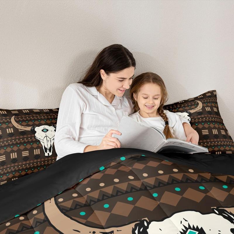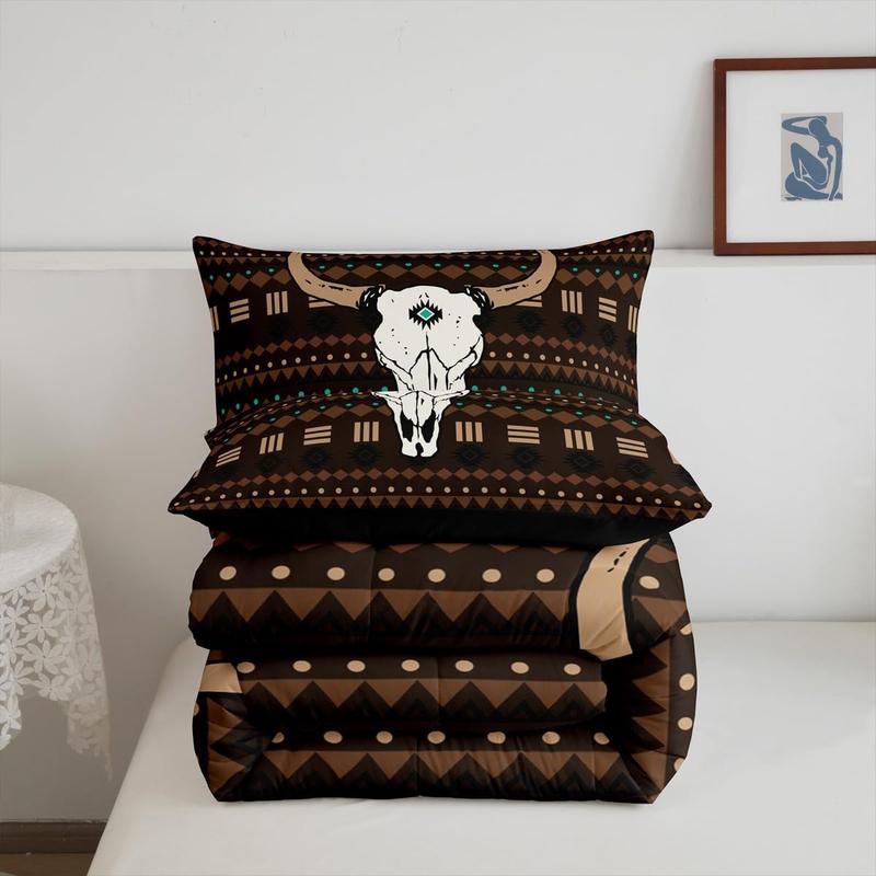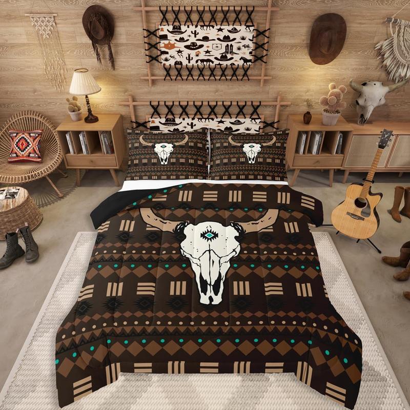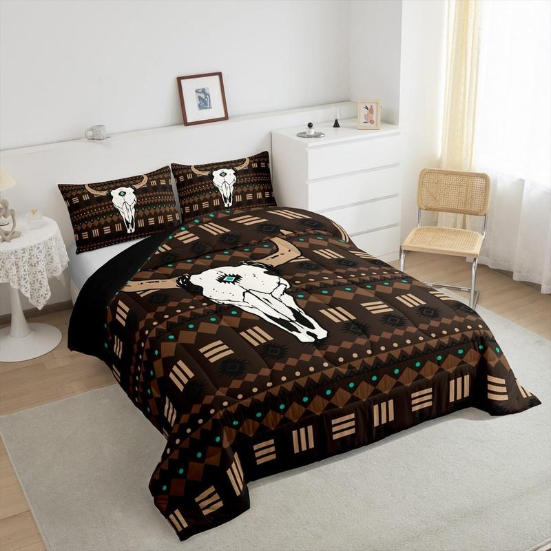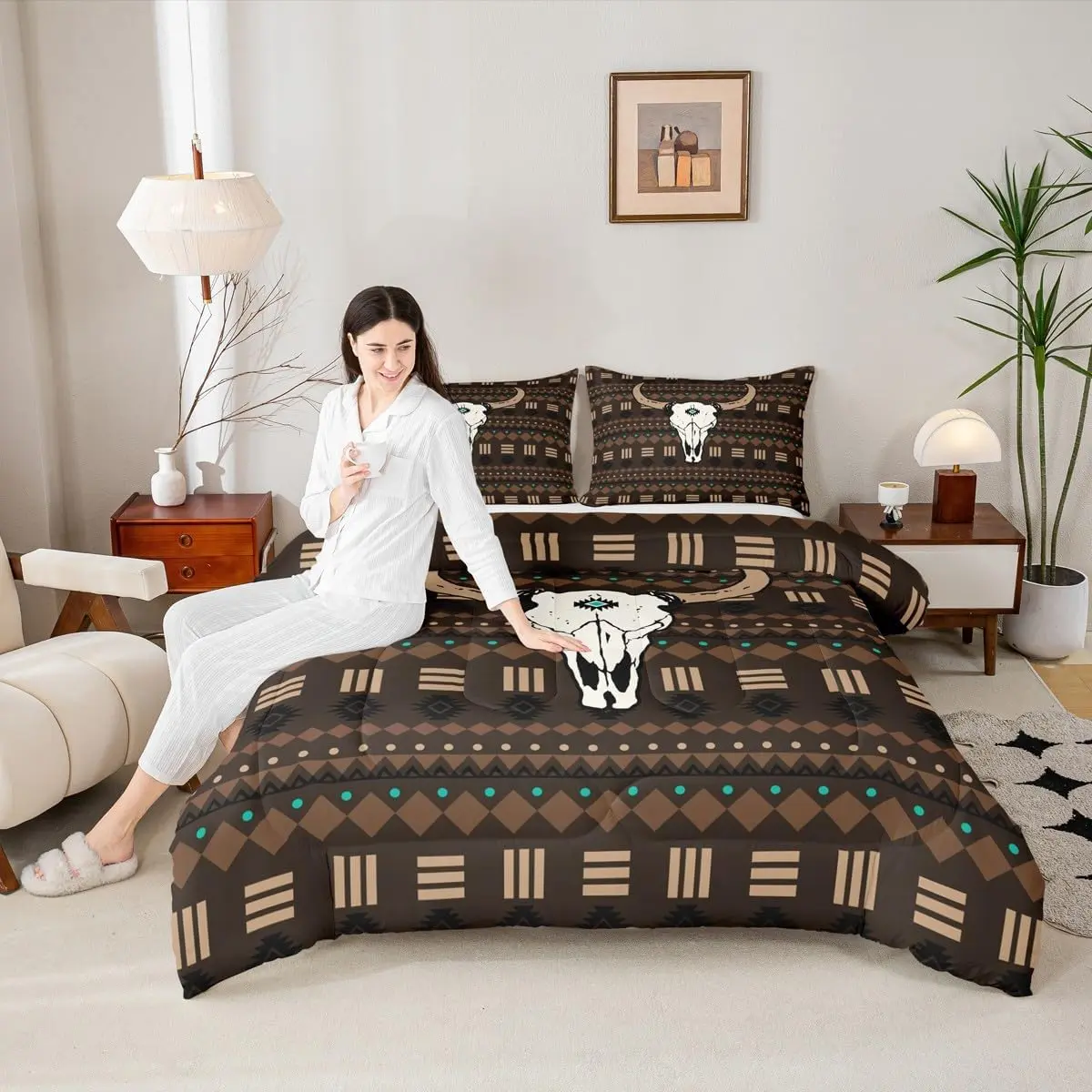 5. Boho Aztec Comforter Set,Bull Skull Bedding Set,Western Cowboy Down Comforter,Native Ethnic Horns Duvet Insert