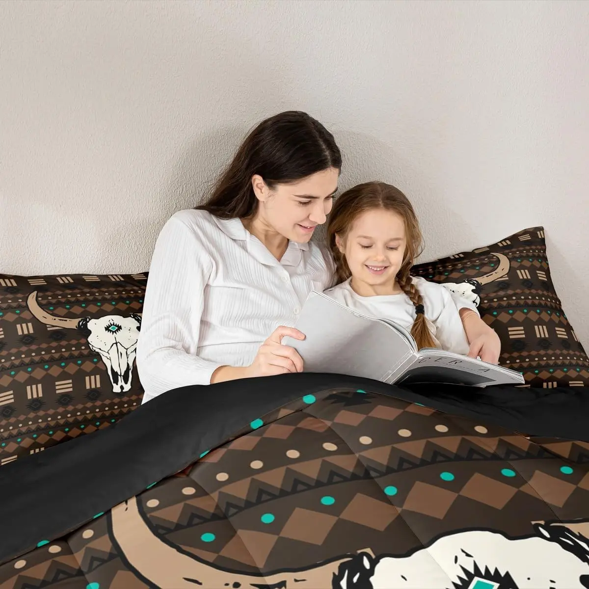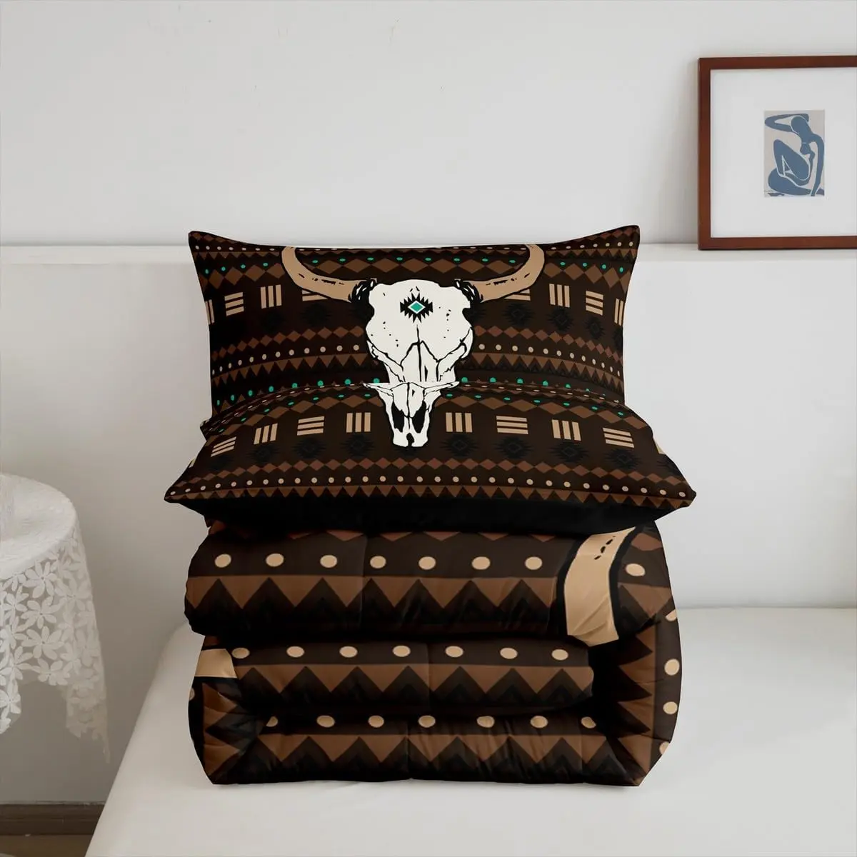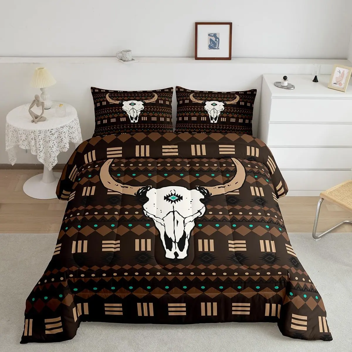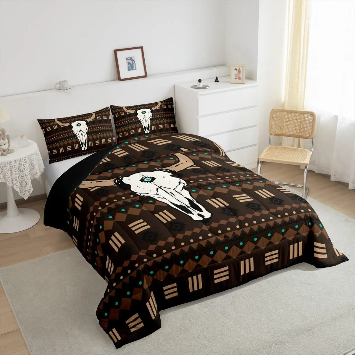 Boho Aztec Comforter Set,Bull Skull Bedding Set,Western Cowboy Down Comforter,Native Ethnic Horns Duvet Insert