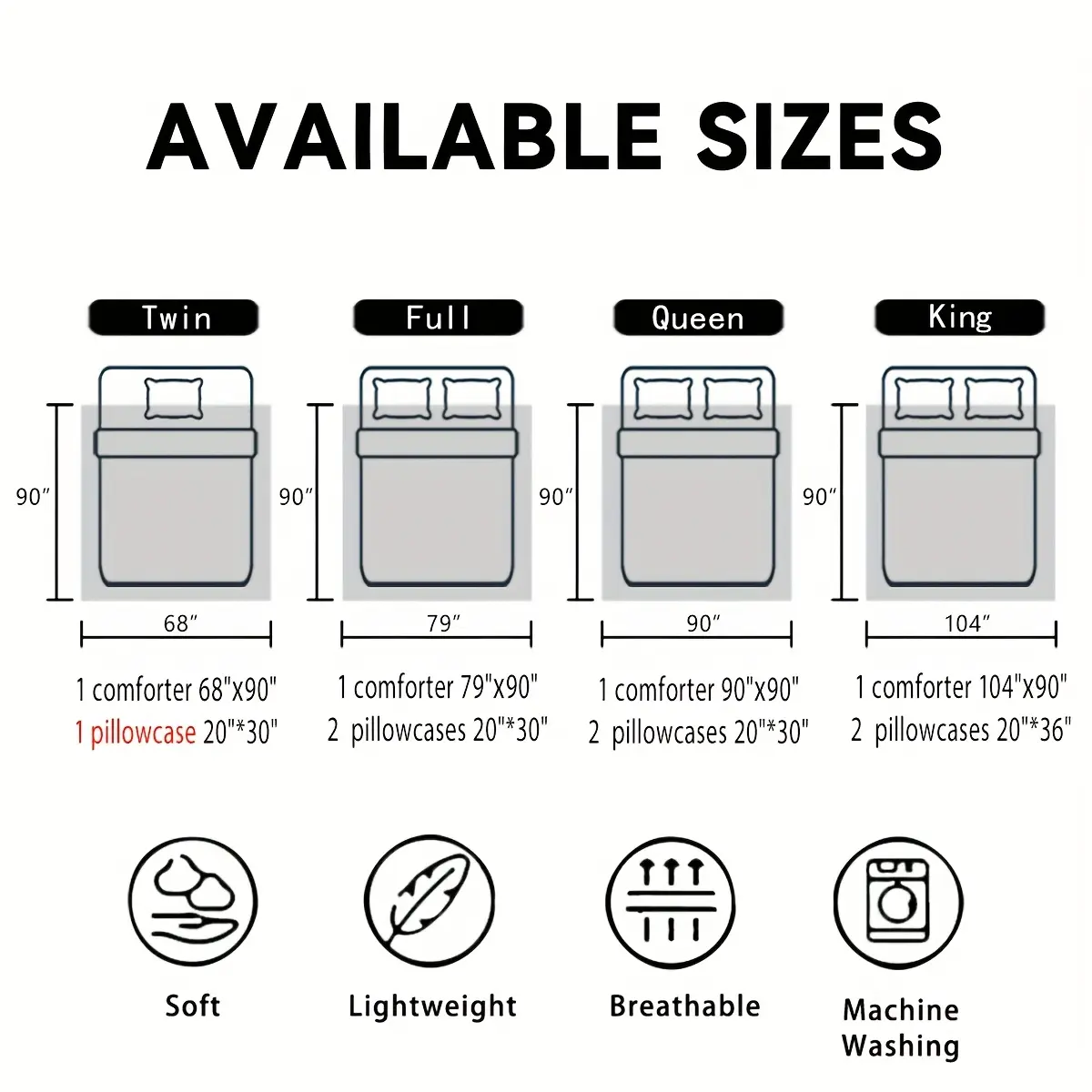 Size: Toddler size includes 1 comforter 42"x58", 1 pillowcase 20"x30";Twin size includes 1 comforter 68"x90", 1 pillowcase 20"x30"; full size includes 1 comforter 79"x90", 2 pillowcases 20"x30"; queen size includes 1 comforter 90"x90", 2 pillowcase 20"x30"; king size includes 1 comforter 104"x90", 2 pillowcase 20"x36"