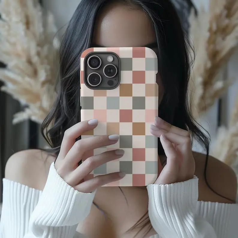 BOHO CHECKERED Case Cute Neutral Phone Cover for iPhone 17 16 15 14 13 12 Pro Max Plus Mini Trendy Phone Accessories Gift For Her Sweet Protection Protective