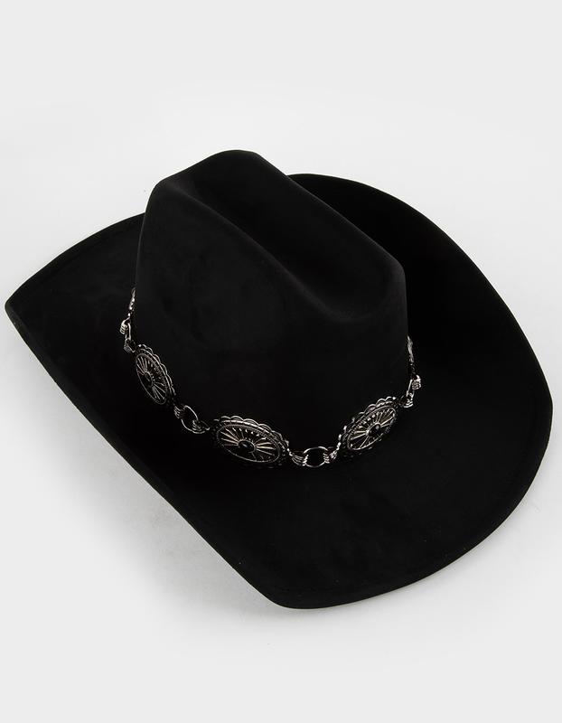 Boho Cowboy Hat. Intricate metal accents around the crown. Approximately 4" brim that curves up at the sides. Approximate crown height: 6". 100% Polyester. Imported. | Womens Boho Cowboy Hat